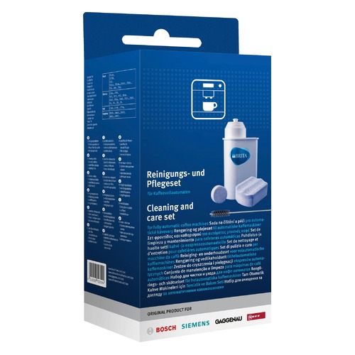 В наборе: 10 таблеток для очистки системы от эфирных масел, 3 таблетки для удаления накипи, 1 фильтр (картридж) для воды, 1 специальная щёточка для прочистки патрубков подачи и выдачи молока.