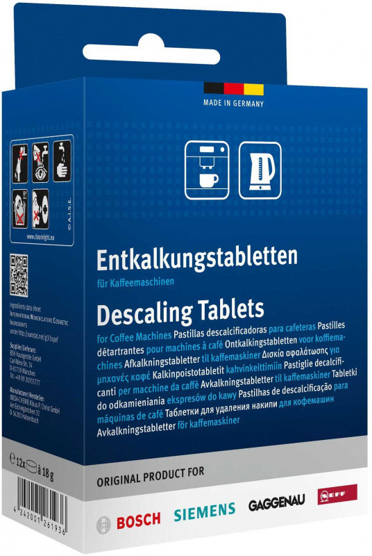 Описание: Таблетки для удаления накипи для кофемашин и чайников - двойная упаковка. Легко дозировать: 12 таблеток для 6-12 применений. Быстро и безопасно для прибора удаляют известковые отложения (накипь). Подходят только для очистки кофемашины от накипи.