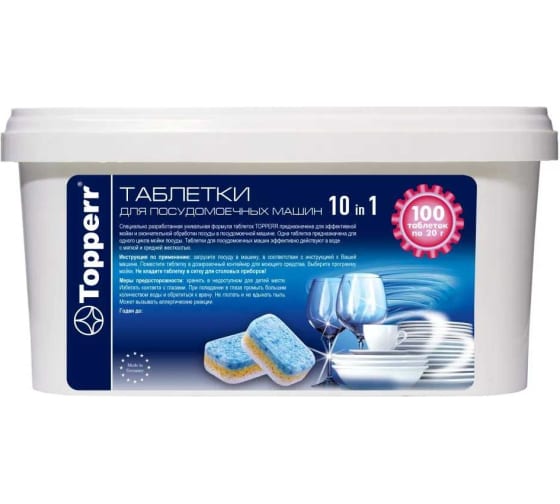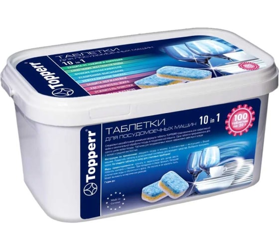 Таблетки для посудомоечной машины Topperr обеспечивают эффективное мытьё посуды. Заменяя соль и ополаскиватель для посудомойки, данное средство для мытья посуды подходит для мягкой и жёсткой воды, безопасно даже после загорания индикатора на пмм "Отсутствует соль и ополаскиватель".