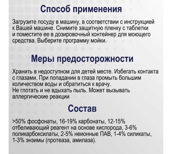 Способ применения: Загрузите посуду в машинку в соответствии с инструкцией. Снимите защитную плёнку с таблетки. Поместите таблетку в дозировочный контейнер для моющего средства.