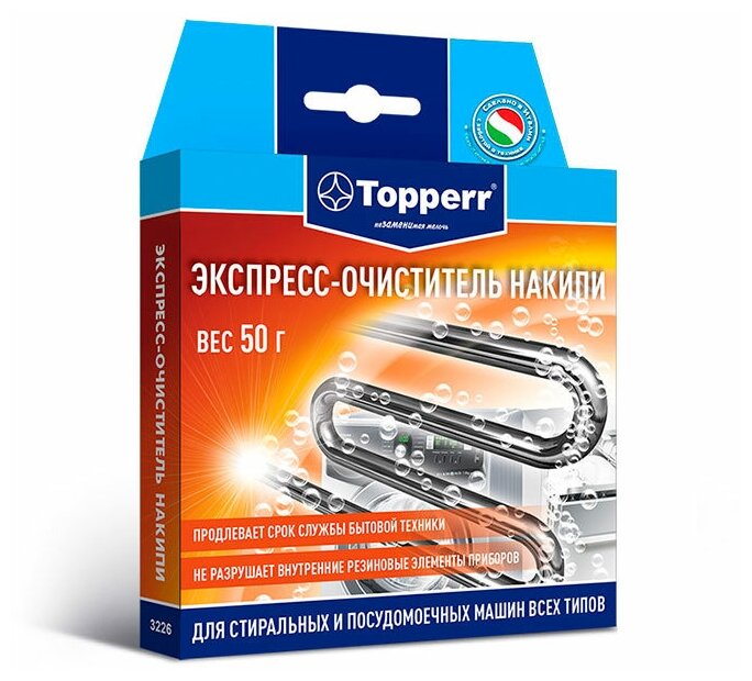 Экспресс-очиститель накипи "Top House" изготовлен по современной технологии с учетом рекомендаций крупнейших производителей стиральных и посудомоечных машин. За одно применение полностью удаляет накипь с нагревательных элементов и внутренних деталей. Продлевает срок службы машин. Сокращает потребление электроэнергии и время выполнения программ.
