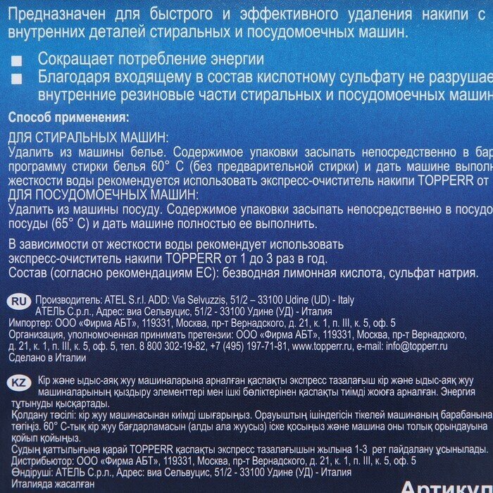 Рекомендуется использовать от 1 до 4 раз в год. Подходит для всех марок и типов посудомоечных и стиральных машин.