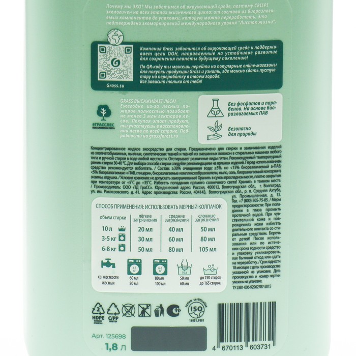 Концентрированное жидкое экосредство для стирки. Предназначено для стирки и замачивания изделий из хлопчатобумажных, льняных, синтетических тканей и тканей из смешанных волокон в стиральных машинах любого типа и ручной стирки в воде любой жесткости. Отстирывает различные виды пятен. Рекомендуемый температурный режим стирки 30-40 °C. Данный продукт имеет экологический сертификат "Листок жизни". "Листок жизни" - единственная в России экомаркировка, признанная на международном уровне. Продукт прошел строгую экологическую проверку по всему жизненному циклу: от добычи сырья до утилизации упаковки. Оценку проводит аккредитованный орган по сертификации "Экологический союз", который работает в соответствии со стандартом ISO 17065.