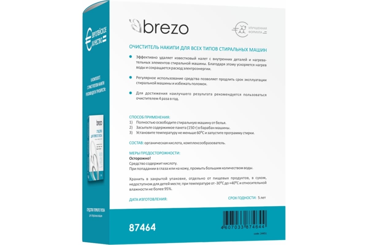 Эффективно удаляет известковый налет с внутренних деталей и нагрева-тельных элементов стиральной машины. Благодаря этому ускоряется нагрев воды и сокращается расход электроэнергии.