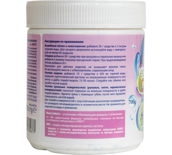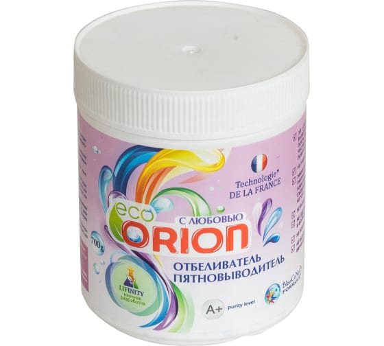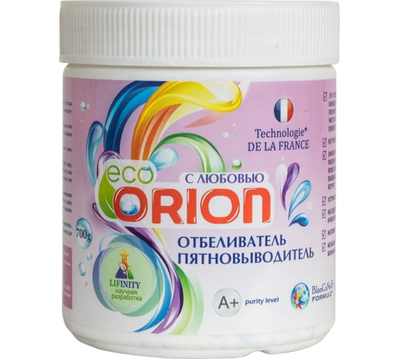 карбонат натрия 5-15%, перкарбонат натрия 15-30%, биоразлагаемый активатор отбеливания менее 5%, сульфат натрия 15-30%, хлорид натрия 10-30%, энзимы (протеаза и амилаза) менее 5%, НПАВ 5%, ИПАВ менее 5%, микрокристаллический диоксид кремния менее 0,5%