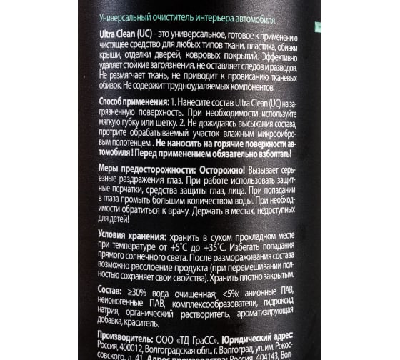 Ultra Clean (UC) - это универсальное, готовое к применению чистящее средство для любых типов ткани, пластика, обивки крыши, отделки дверей, ковровых покрытий. Эффективно удаляет стойкие загрязнения, не оставляет следов и разводов. Не размягчает ткань, не приводит к провисанию тканевых обивок. Не содержит трудноудаляемых компонентов