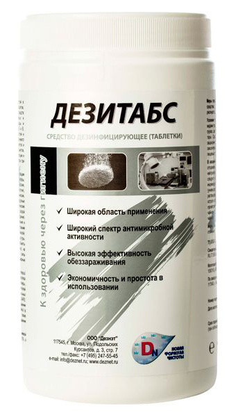 Химический состав дезсредства Дезитабс: хлорсодержащие (выделяющие активный хлор) действующие вещества: натриевая соль дихлоризоциануровой кислоты 84%Содержание активного хлора - 45%.