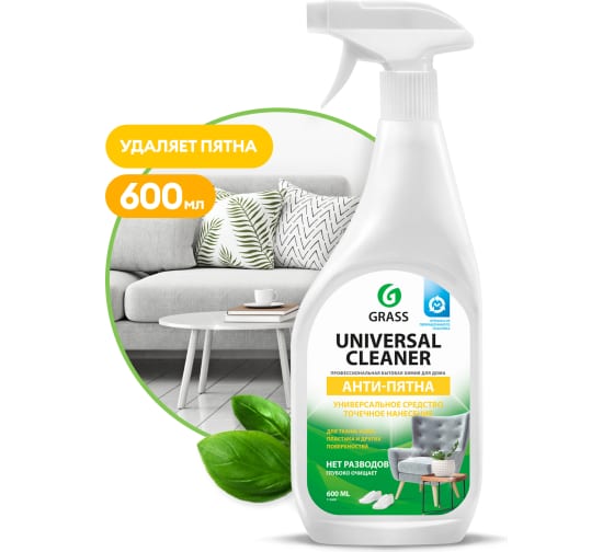 Универсальное чистящее средство для уборки для чистки мягкой мебели ковров 600 мл Grass Universal Cleaner 112600 подходит для уборки чистки ковров мягкой мебели ковролина обуви белой подошвы Universal Cleaner Professional Grass Грасс 112600 подходит для уборки дома чистки поверхностей, например линолеума, полимерных покрытий, керамической плитки, ламината, паркета, дерева, нержавеющей стали, стеклянных поверхностей, а также изделий из ткани и кожи, не повреждая волокон тканей. Спрей для уборки можно использовать для чистки дивана и мягкой мебели, а также для очищения тканей и как пятновыводитель. universal cleaner professional спрей эффективное средство для регулярной уборки помещений и химчистки мебели. Готовое к применению средство не оставляет разводов и устраняет нейтрализует неприятные запахи. Эффективен с отбеливанием поверхностей, в том числе подошвы обуви.