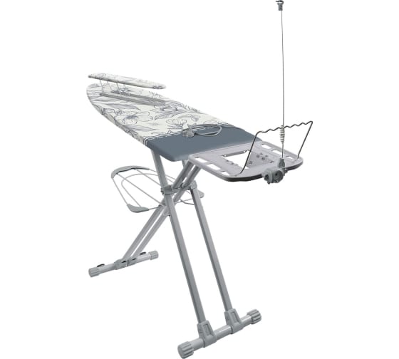Широкая гладильная доска предназначена для глажки белья. Модель оснащена электросоединителем и эргономичной подставкой под утюг.