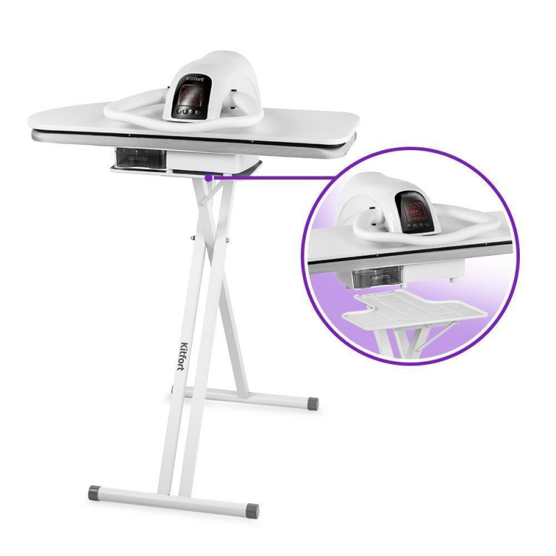 Она состоит из столешницы, на которой удобно расположить гладильный пресс, и ножек для создания устойчивого положения. В комплектацию не входит, приобретается отдельно.