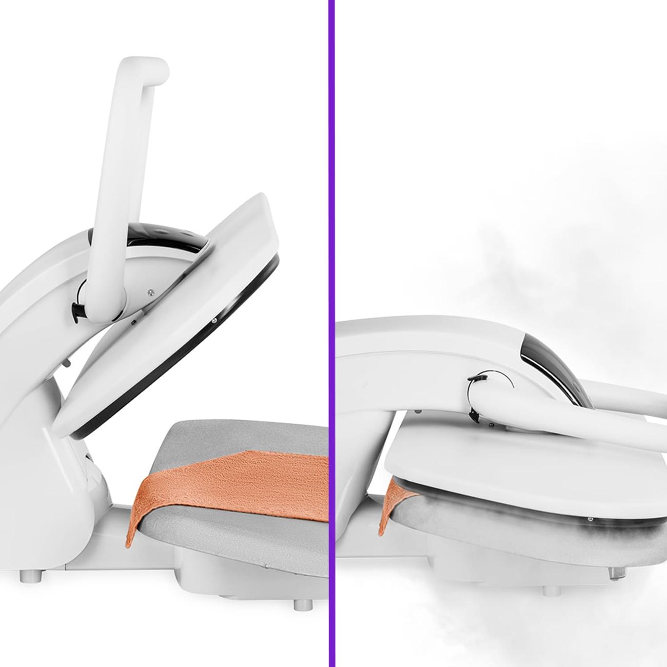 Гладильный пресс оборудован помпой (водяным насосом). Когда вы опускаете рабочую панель, в корпусе срабатывает помпа с характерным щелчком. Затем вода из резервуара прокачивается на разогретую поверхность, где под воздействием высокой температуры она превращается в пар и под давлением выходит из паровых сопел.