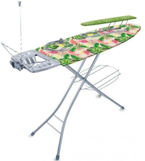 Гладильная доска с электросоединителем и подставкой под утюг, регулируемая по высоте. Удобная полка для белья и переносной подрукавник