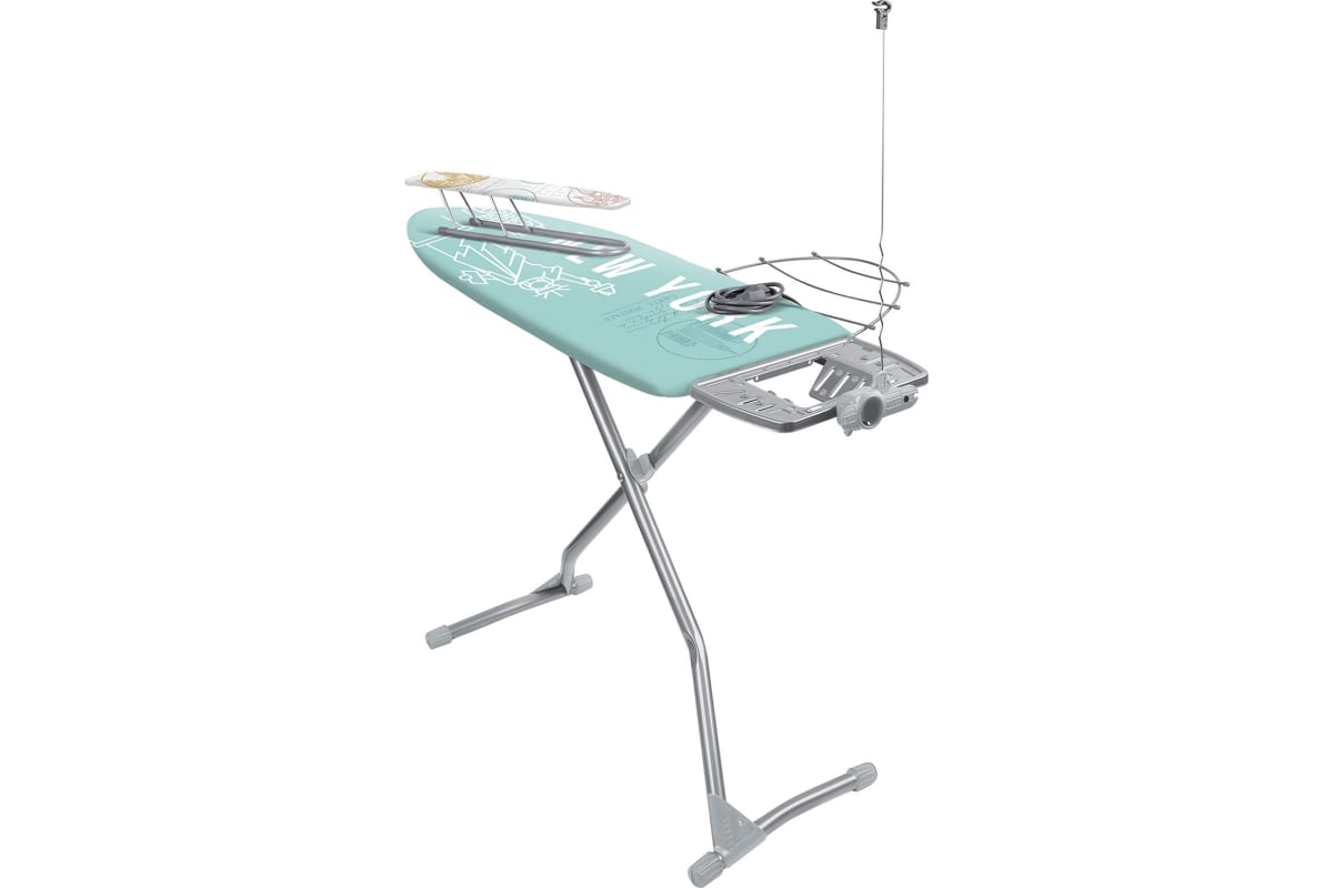 Доску можно регулировать по высоте. В конструкции предусмотрена откидная полка для белья и переносной подрукавник.