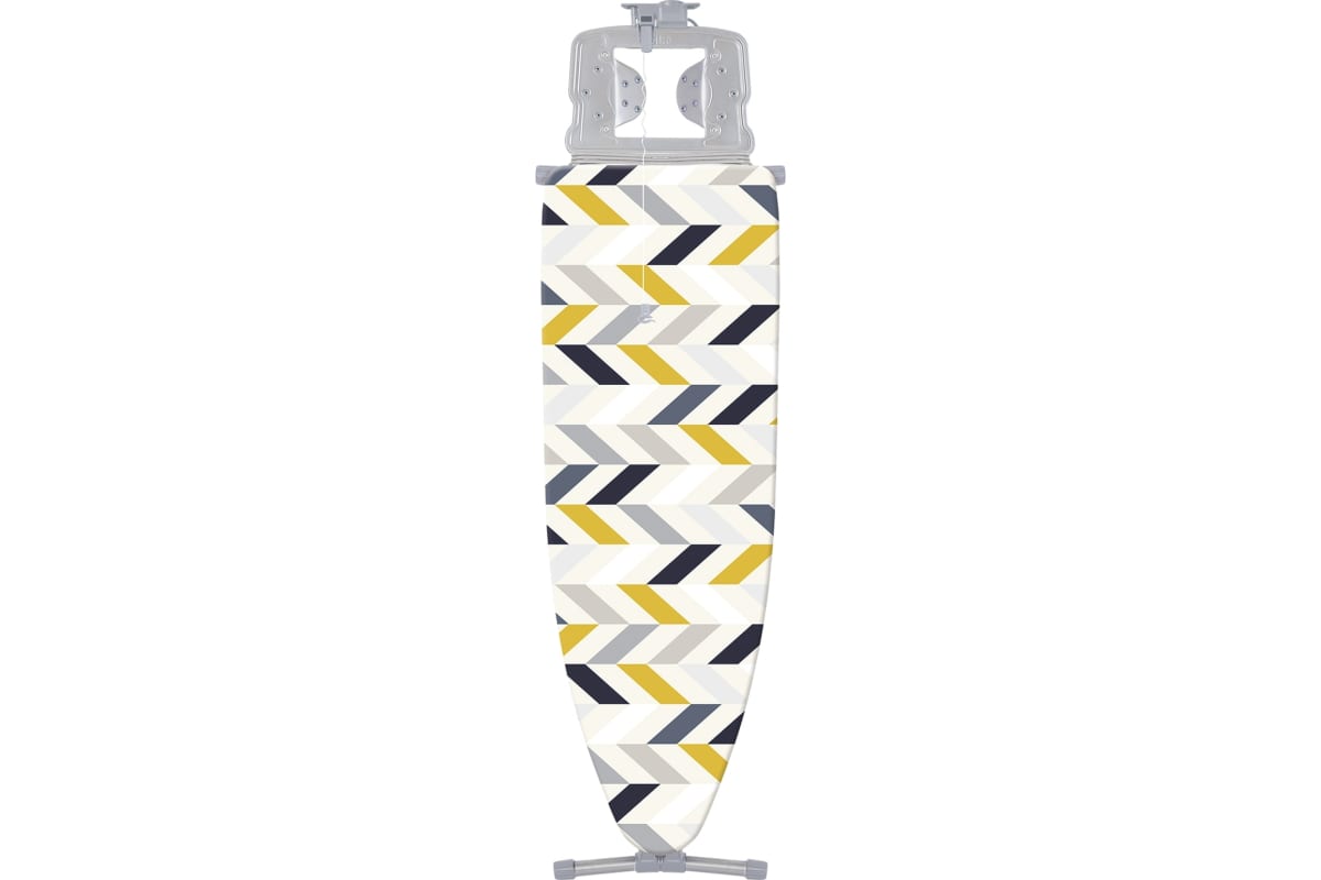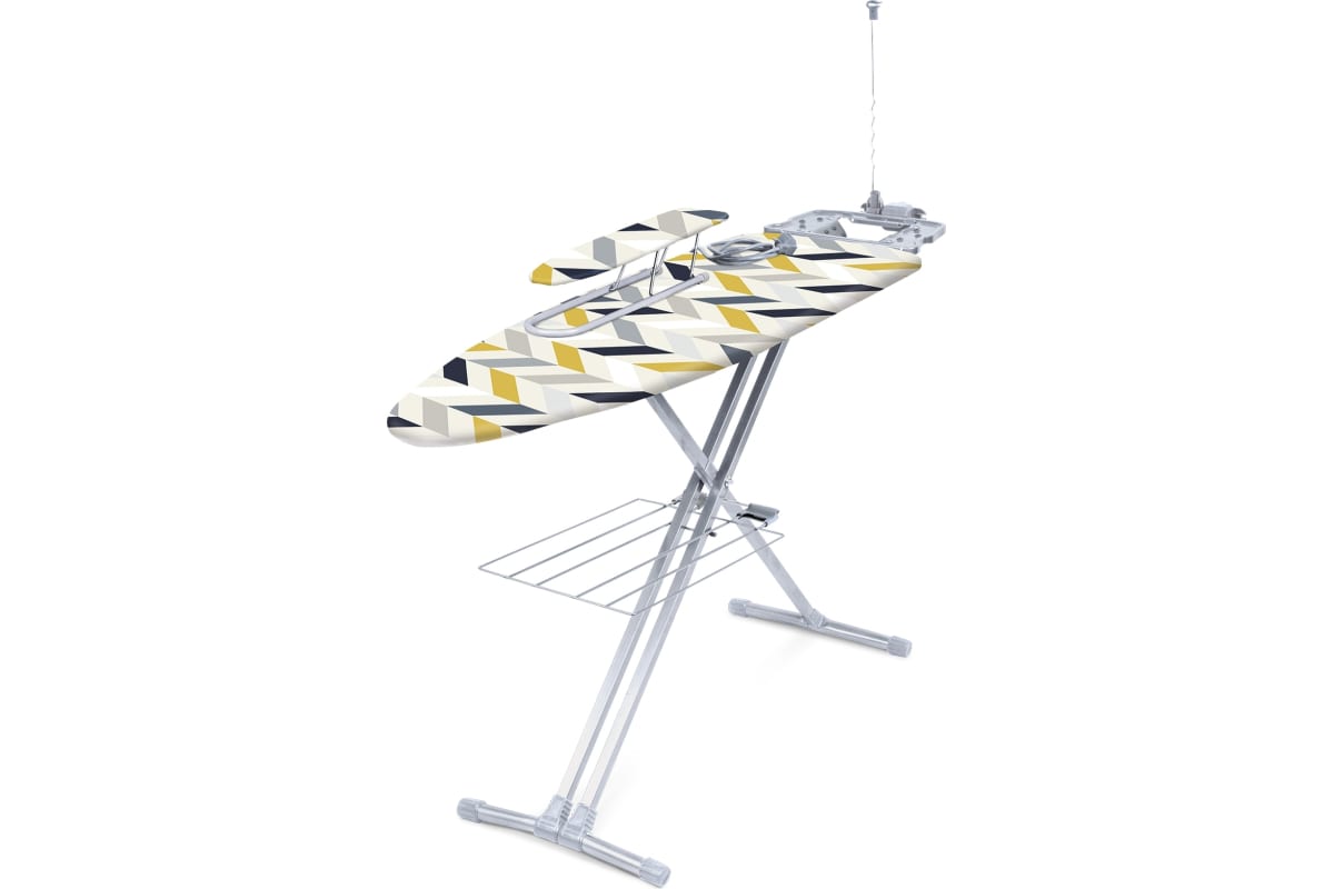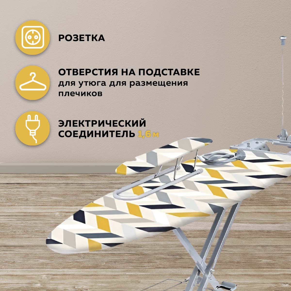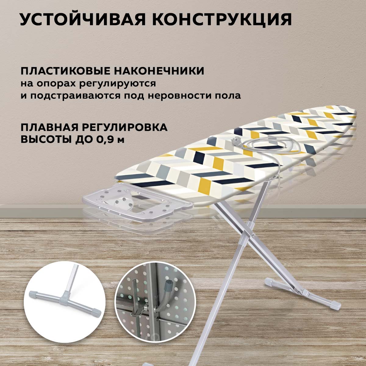 Доску можно регулировать по высоте. В конструкции предусмотрена откидная полка для белья и переносной подрукавник.
