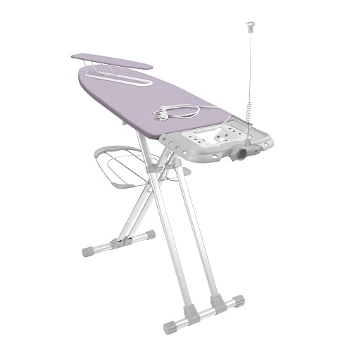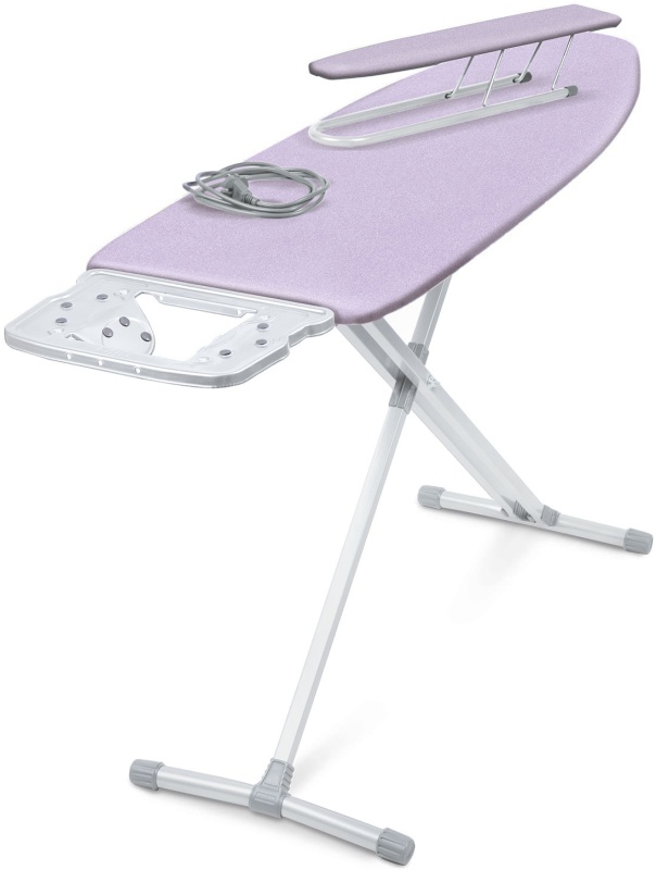 Широкая гладильная доска с электросоединителем и подставкой под утюг и парогенератор. Вместительная полка для белья и переносной подрукавник.