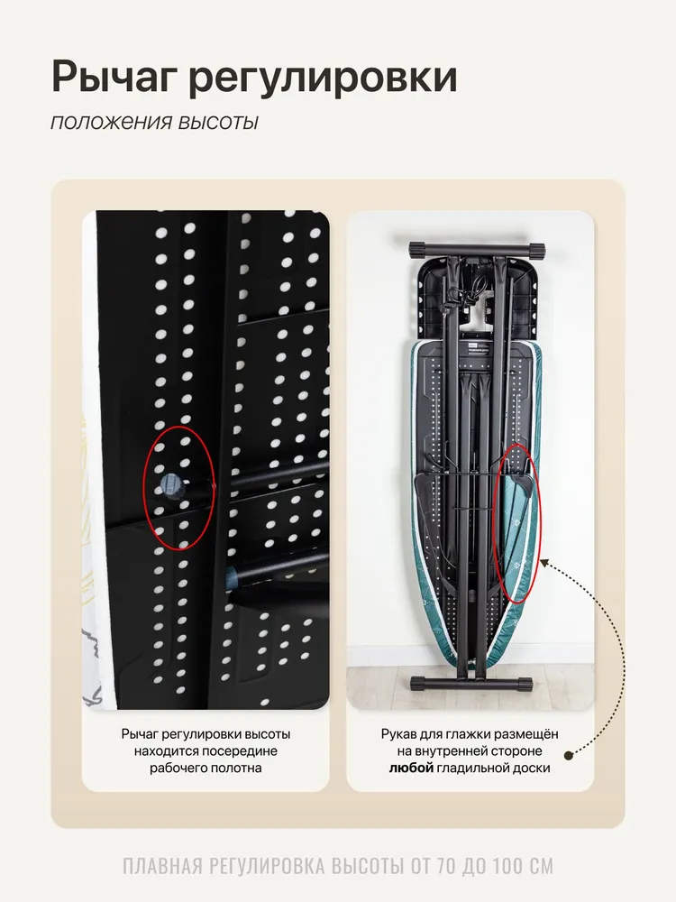 Подходит для правшей и левшей. Доску можно плавно регулировать по высоте. Регулируемые опоры служат для устойчивости доски на неровном полу.