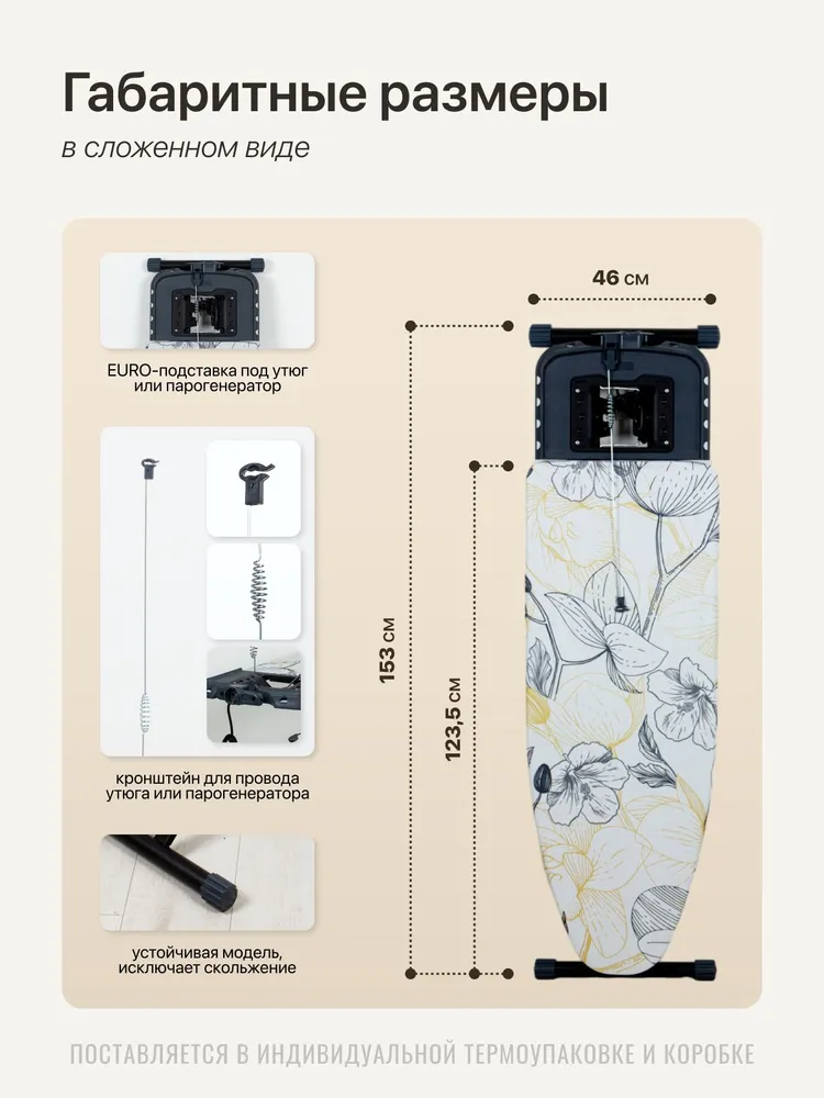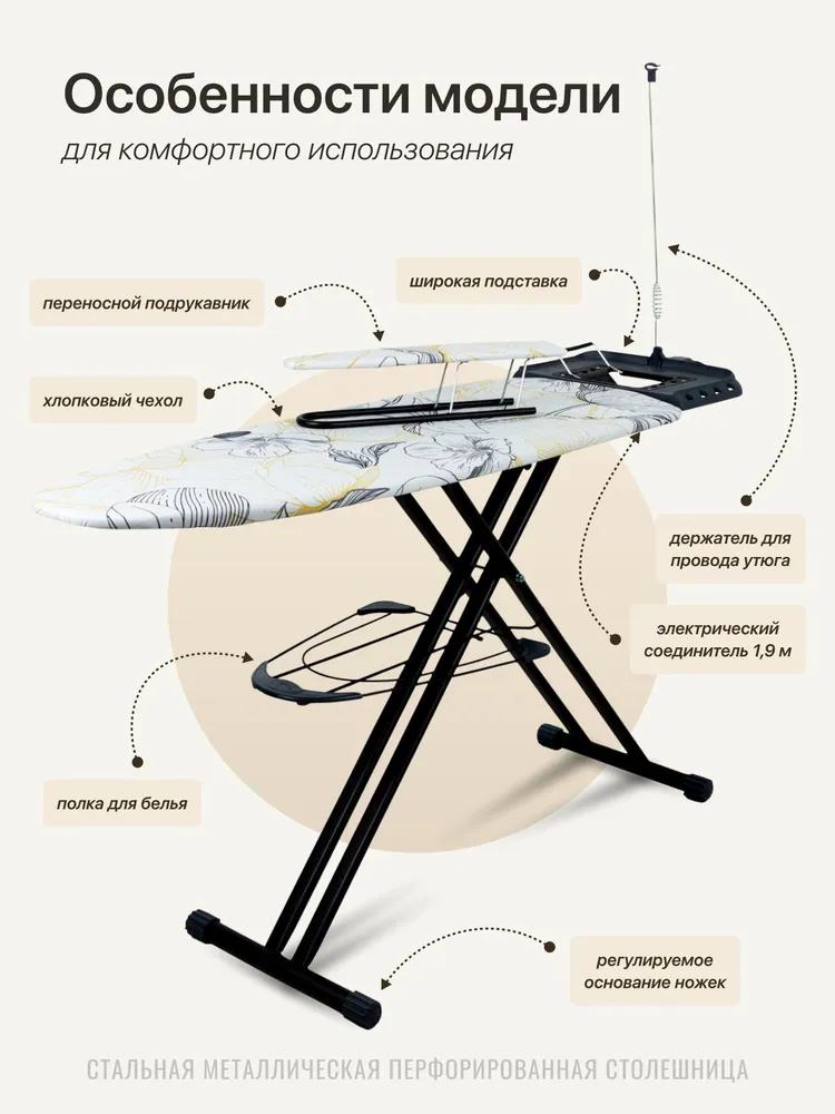 Широкая гладильная доска предназначена для глажки белья. Модель оснащена электросоединителем и эргономичной подставкой под утюг.