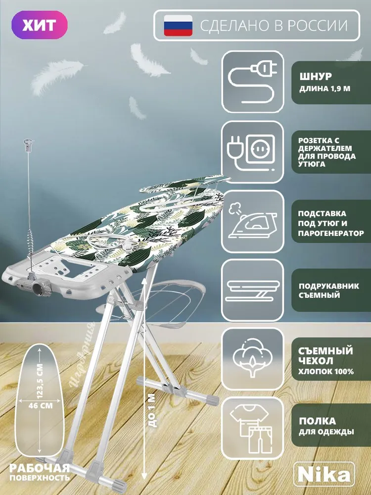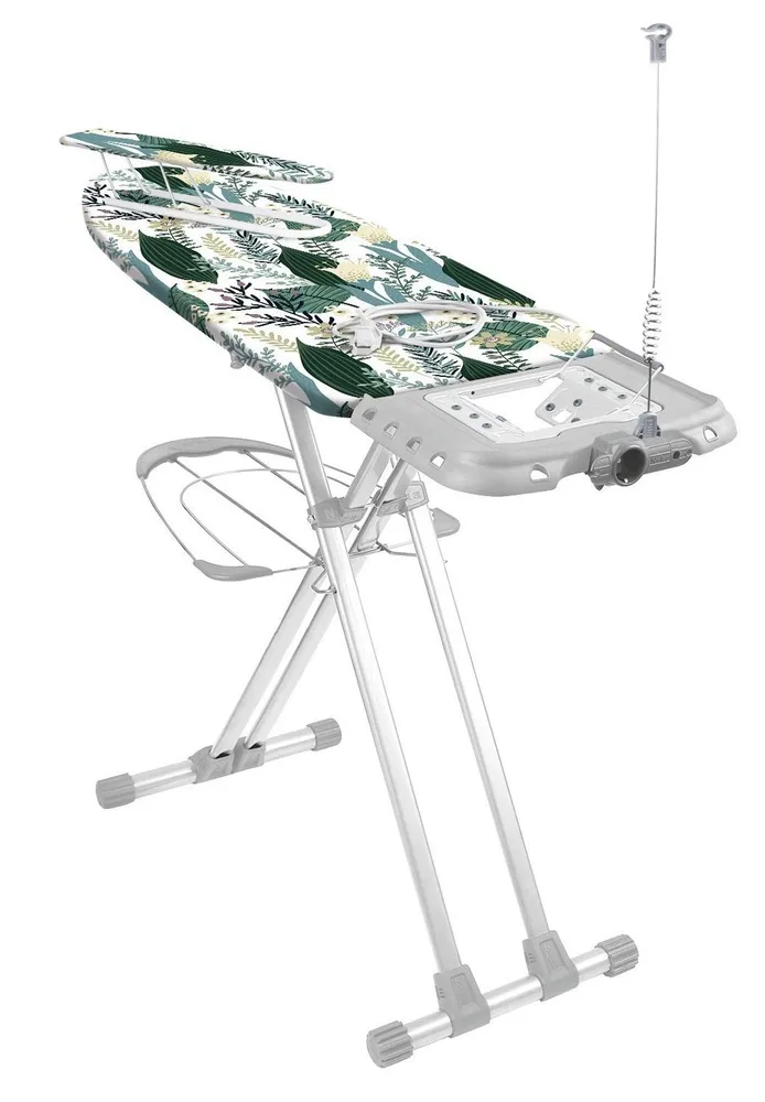 Широкая гладильная доска с электросоединителем и подставкой под утюг и парогенератор. Вместительная полка для белья и переносной подрукавник.