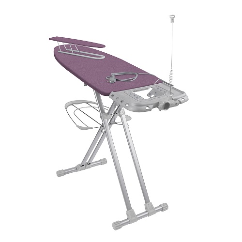 Широкая гладильная доска с электросоединителем и подставкой под утюг и парогенератор. Вместительная полка для белья и переносной подрукавник.