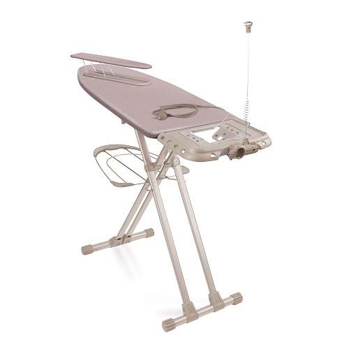 Широкая гладильная доска с электросоединителем и подставкой под утюг и парогенератор. Вместительная полка для белья и переносной подрукавник.