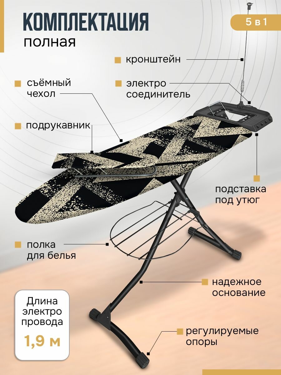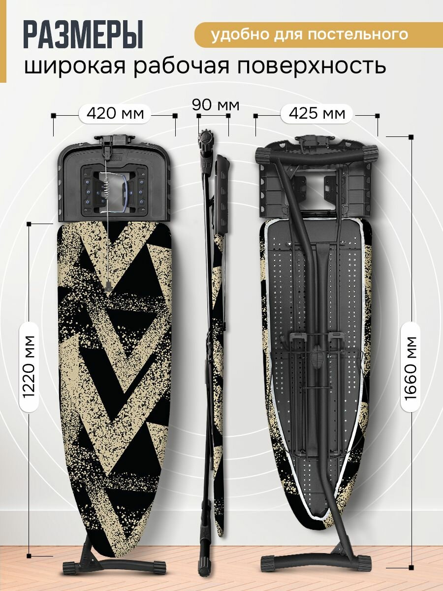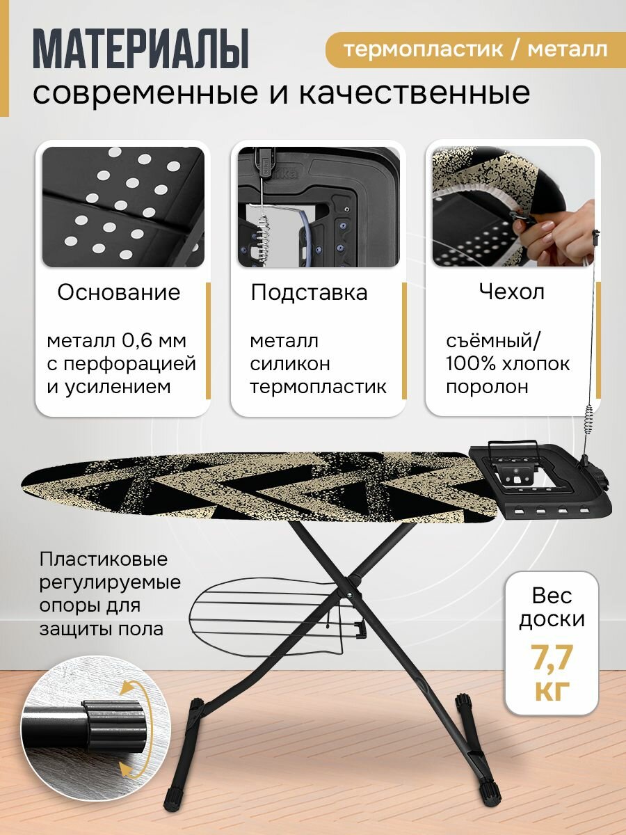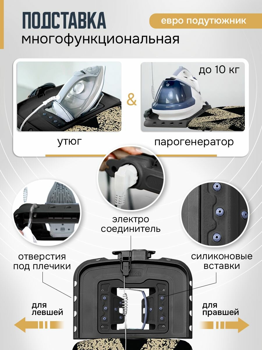 Подходит для правшей и левшей. Доску можно плавно регулировать по высоте. Регулируемые опоры служат для устойчивости доски на неровном полу. Доска оснащена вместительной полкой для белья и переносным подрукавником.