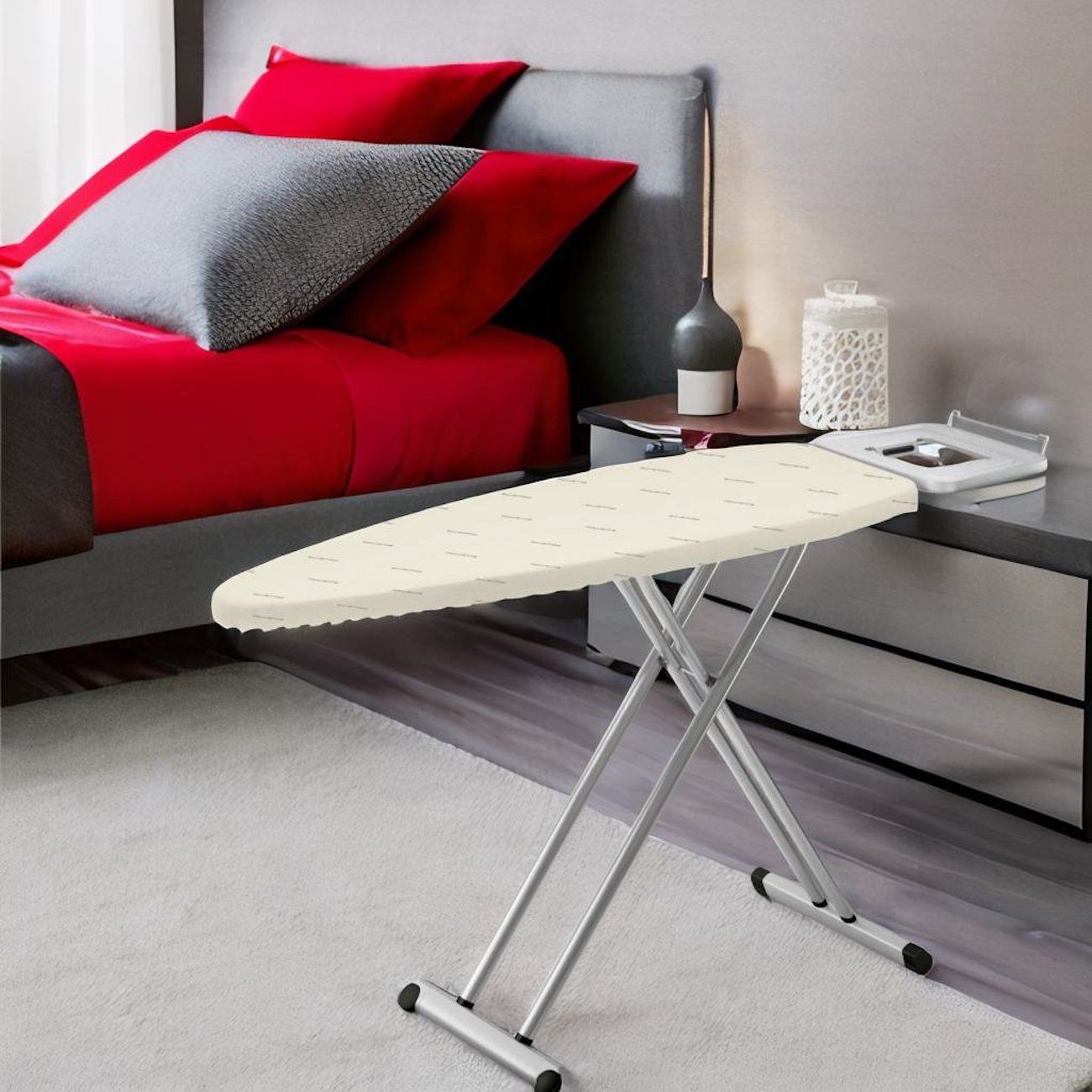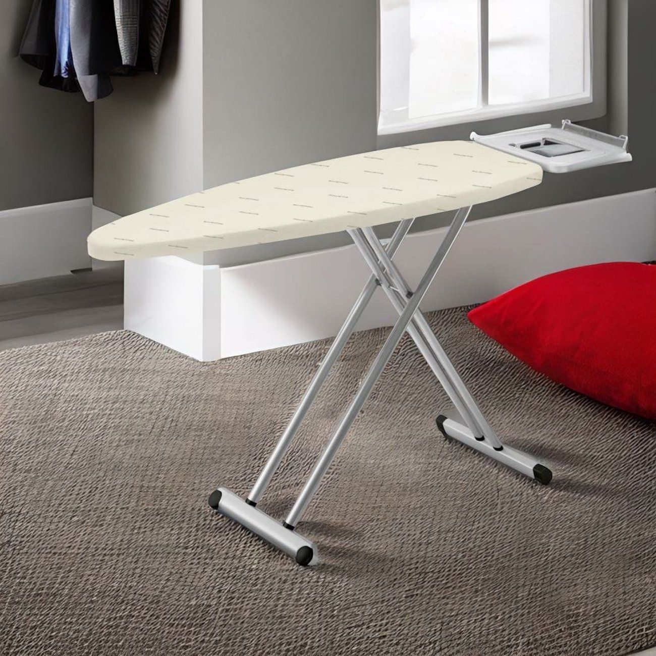 Чехол хлопковый, гладко натянутый, любая подошва будет легко по нему скользить. В качестве наполнителя использован поролон. Широкая подставка подойдёт и для утюга, и для парогенератора. Высота приспособления регулируется (максимальная – 93 см), так что вы подстроите её под свой рост, а при желании даже сможете гладить сидя. Конструкция устойчива и надёжна, металлические ножки снабжены колёсиками для простоты перемещения устройства. Доска складывается, её удобно хранить.