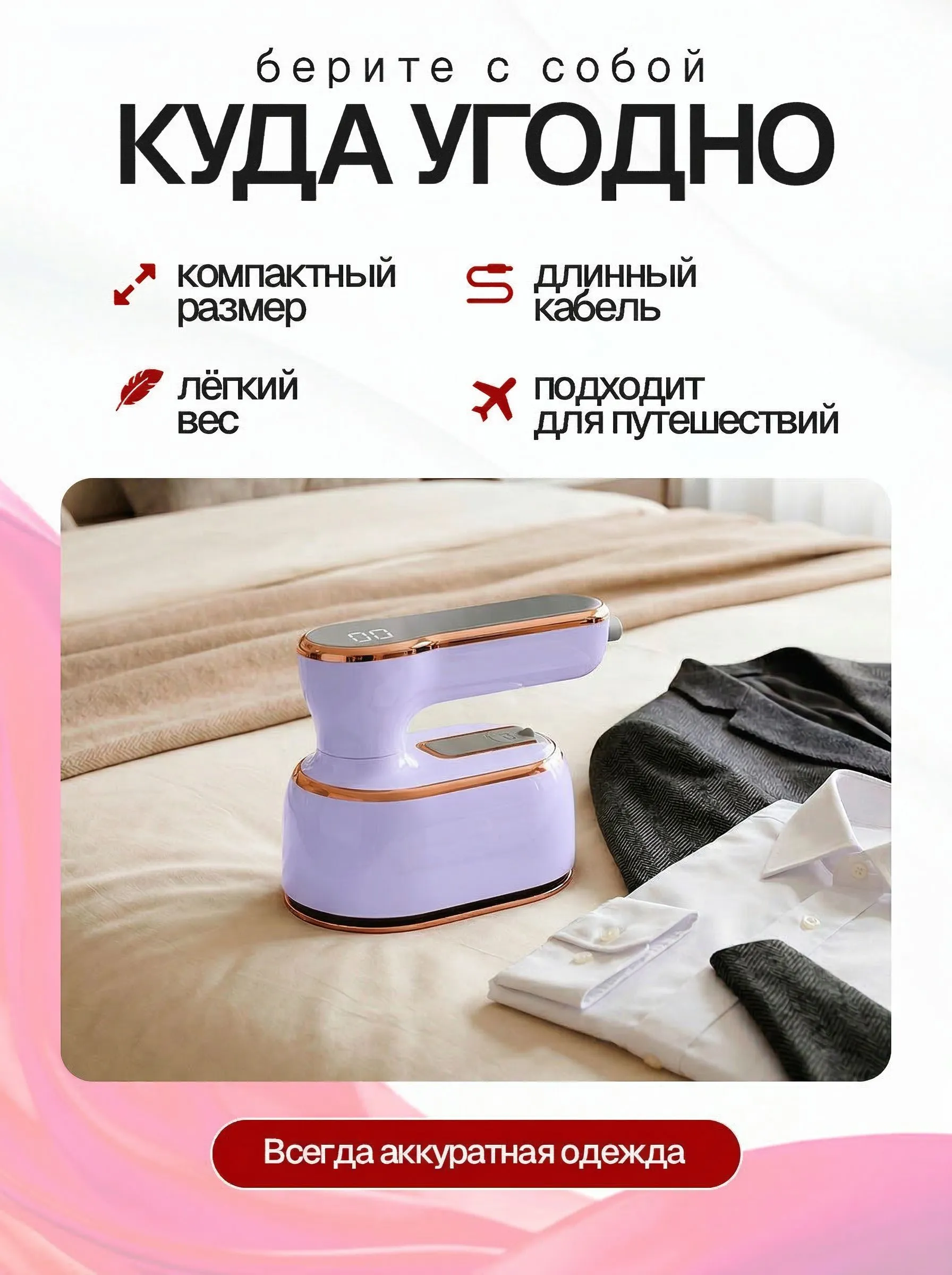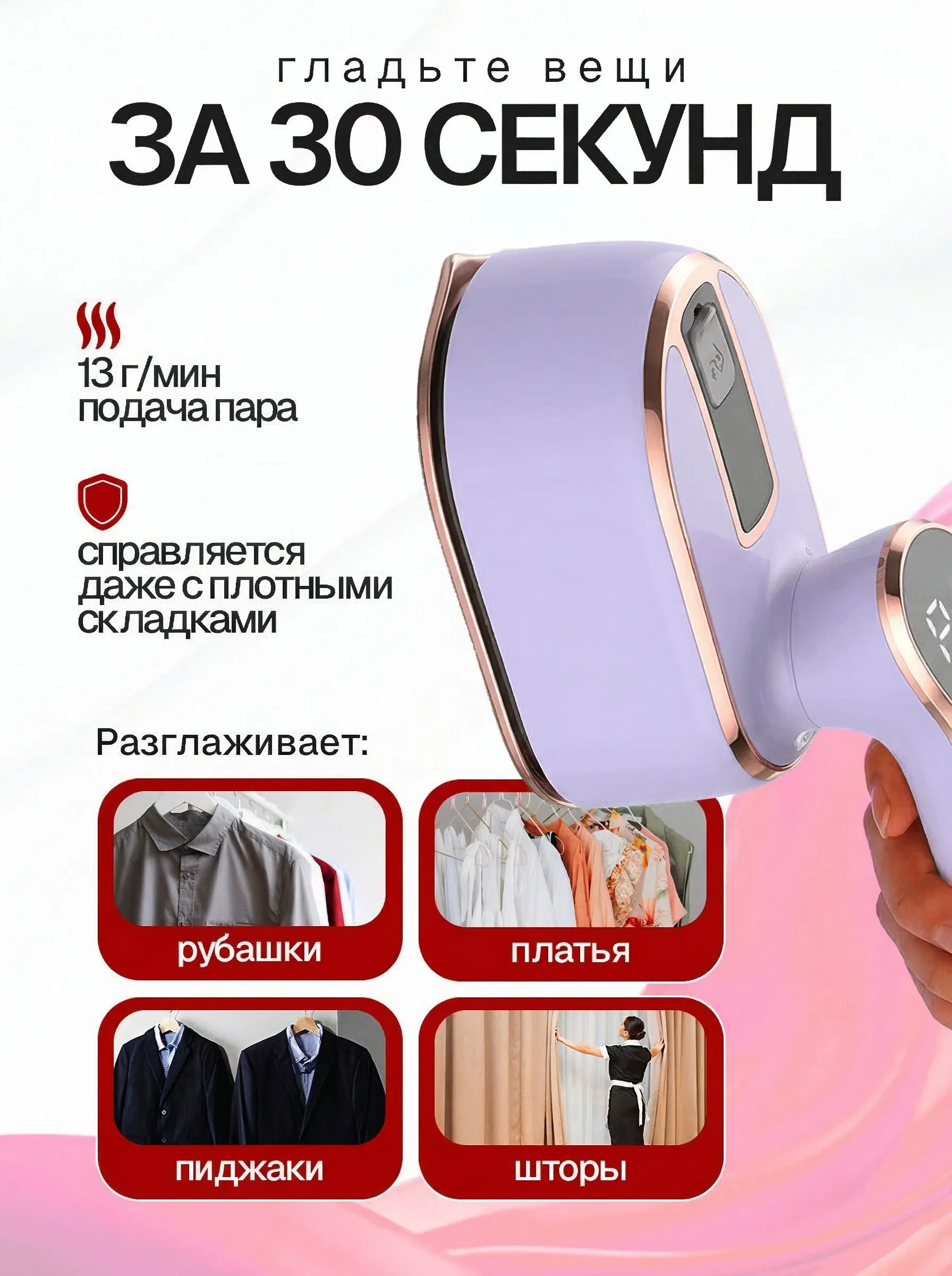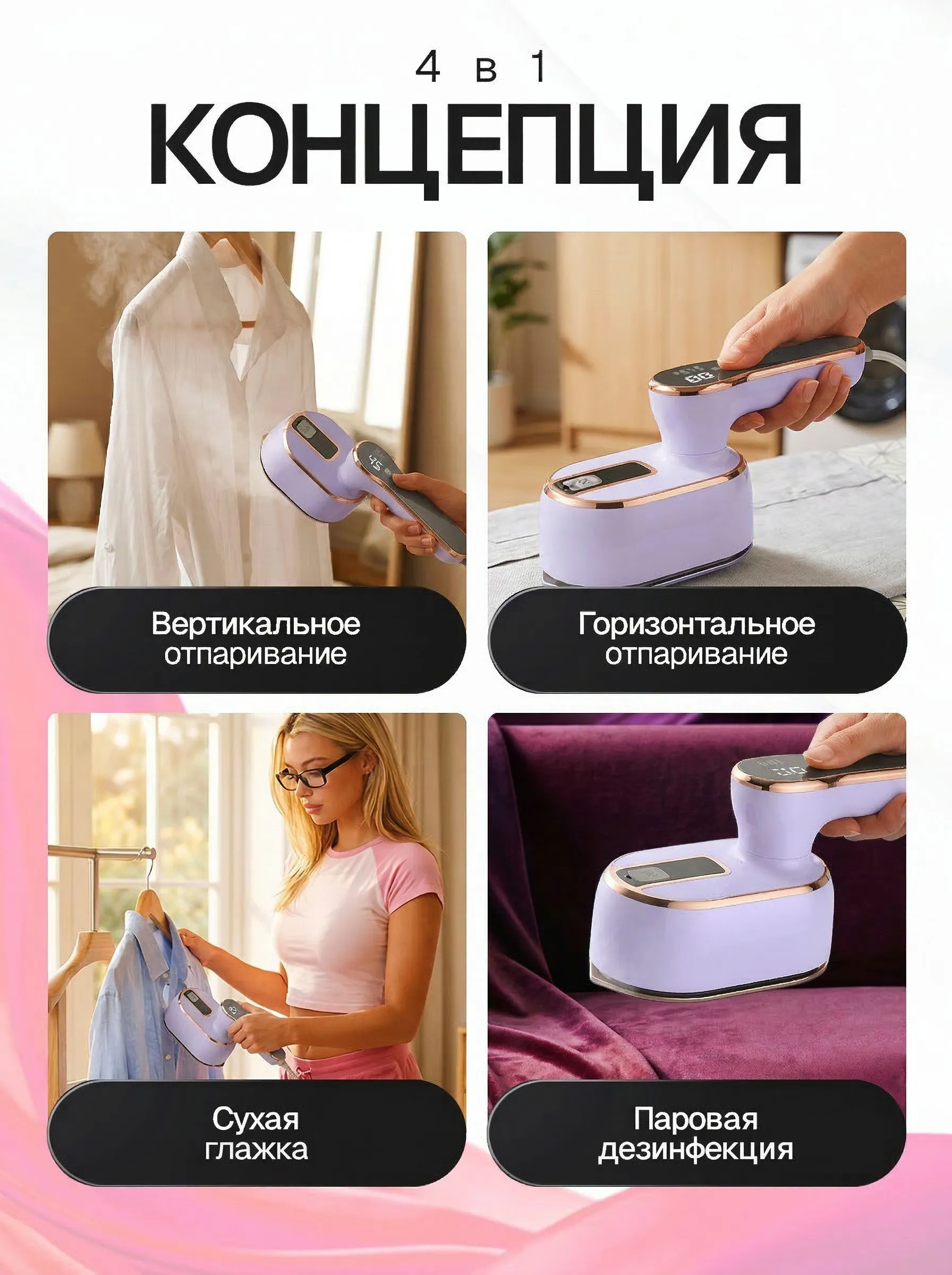 Особенности утюга, отпаривателя: Вертикальное отпаривание, Горизонтальное отпаривание, Дозалив воды, Ручной