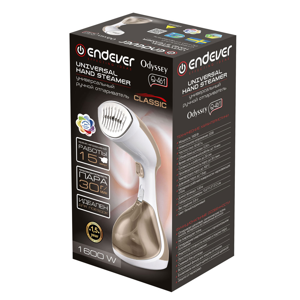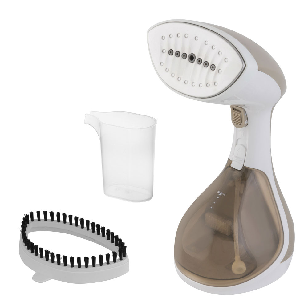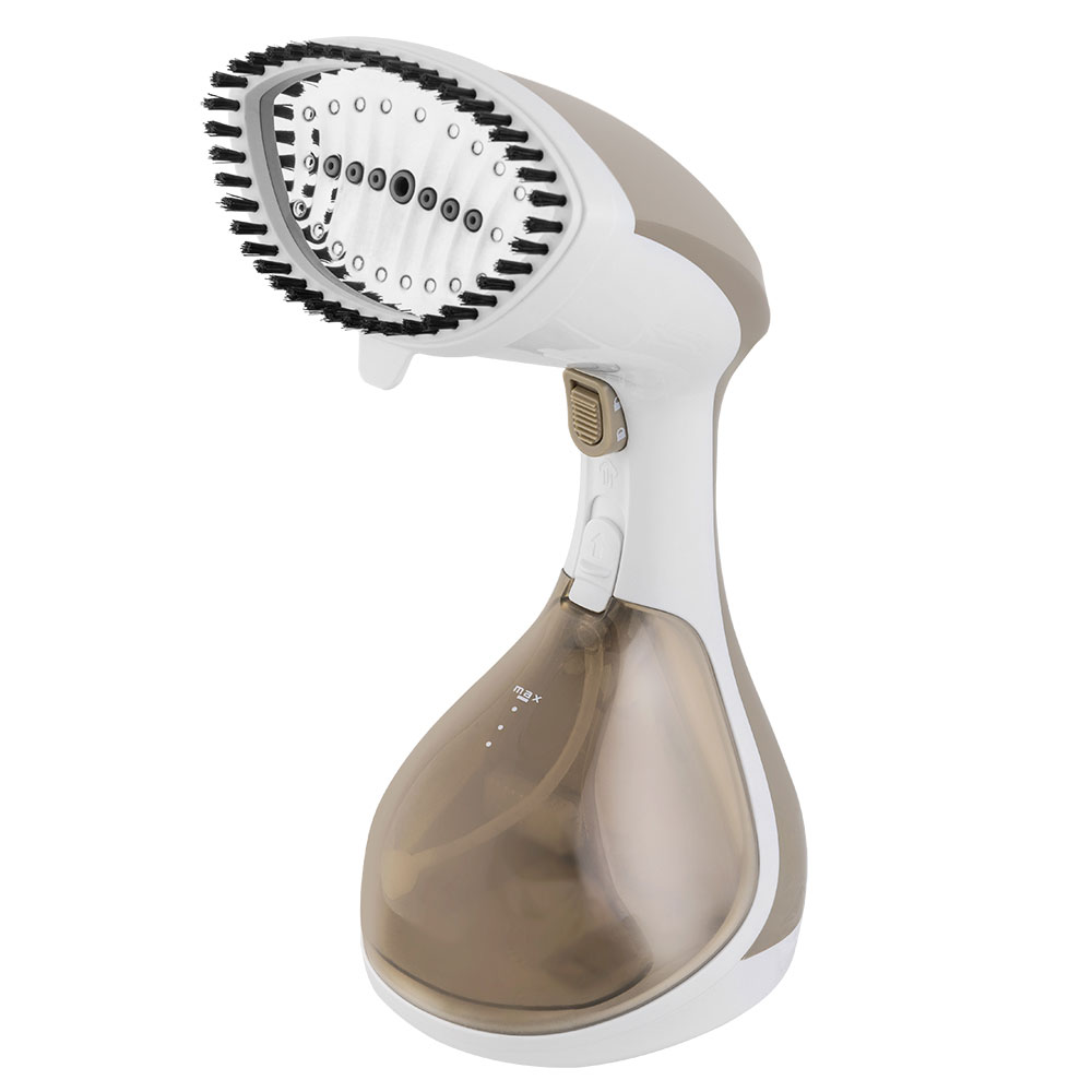 Отпаривает щелковые, синтетические ткани, хлопок, материалы из смешенных волокон, Не повреждает ткань, Отпаривание в вертикальном и горизонтальном положении, Индикатор готовности нагрева и подачи пара, Простота в использовании, Съемный бак для воды, Функция очистки от накипи, В комплекте насадка-щетка с длинной щетиной, Защита от перегрева