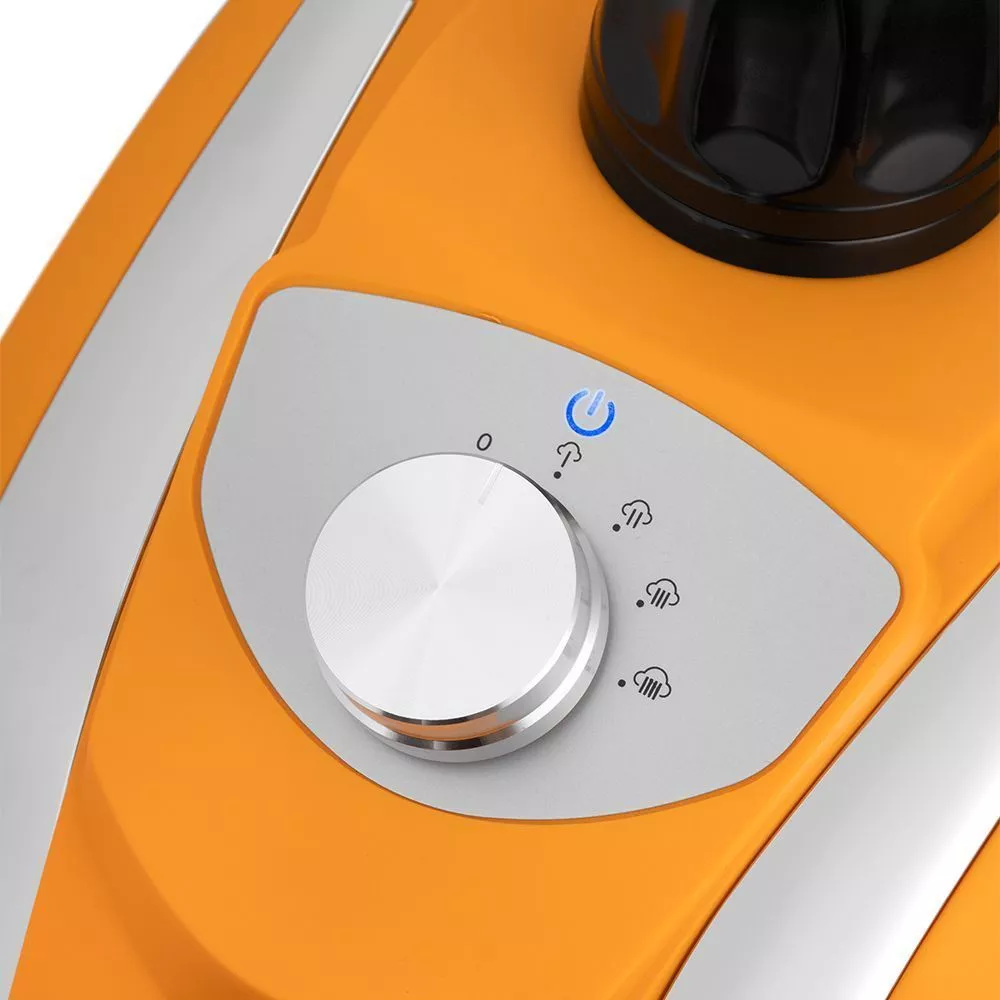 Отпариватель легко управляется поворотным барабаном. Он большой и удобно располагается на корпусе. Четыре уровня подачи пара устанавливаются поворотом по часовой стрелке. Яркий индикатор сверху показывает, что устройство работает.