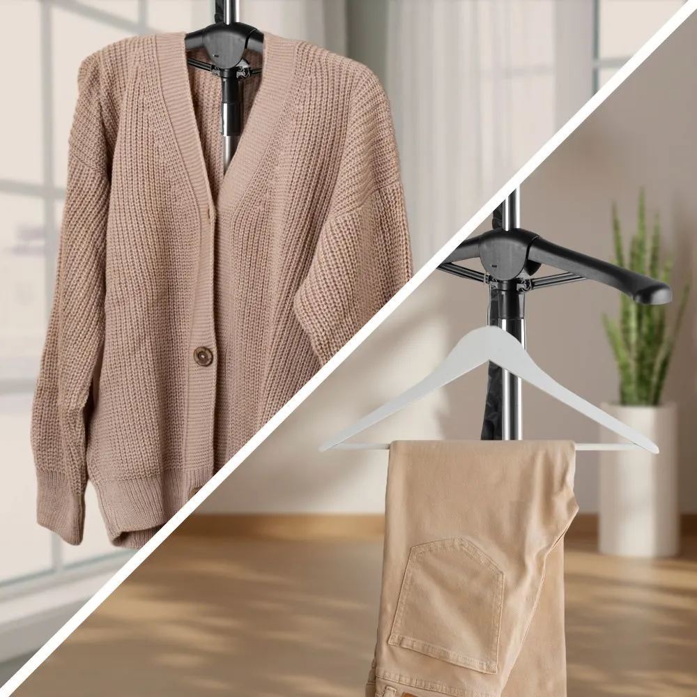 С помощью телескопической стойки можно настроить высоту прибора для удобной работы. В комплекте есть складная вешалка и держатель утюжка с крючками, на которые можно повесить обычные вешалки. С помощью дощечки для глажки можно прогладить мелкие детали.