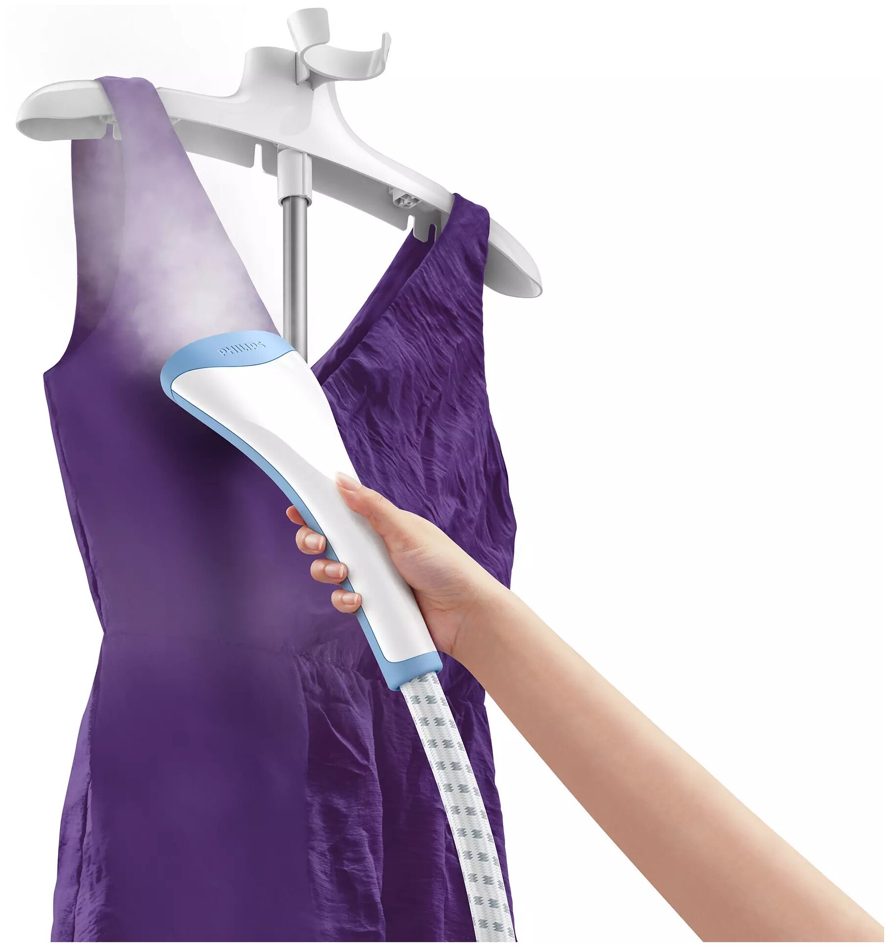 2 режима подачи пара; подходит для ухода за всеми тканями; в комплекте: рукавица для дополнительной защиты, вешалка для одежды, регулируемая стойка;