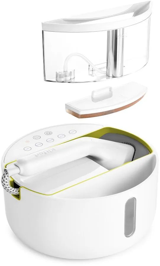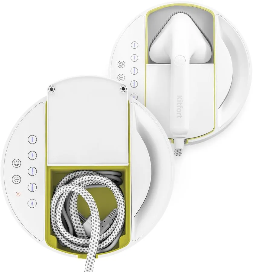 На корпусе отпаривателя есть отсек для хранения парового шланга и шнура, закрываемый крышкой. Сам утюжок надёжно фиксируется в отверстии со специальной силиконовой подложкой, поэтому нагретый утюжок можно устанавливать туда прямо во время работы.
