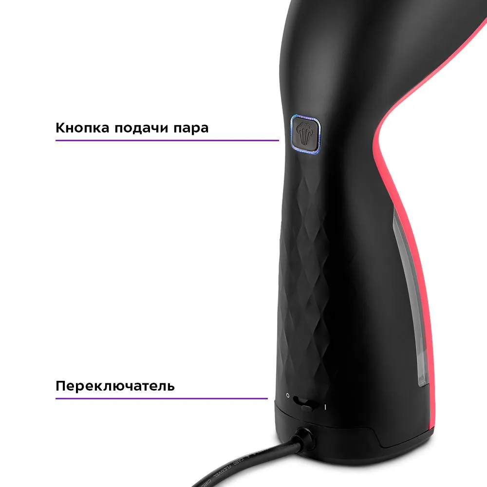 Переключать снизу включает и выключает устройство. После включения, спустя 30 секунд, вода нагреется, и вы можете приступать к отпариванию вещи. Нажмите и удерживайте кнопку подачи пара - пар начнёт выходить из паровых сопел.