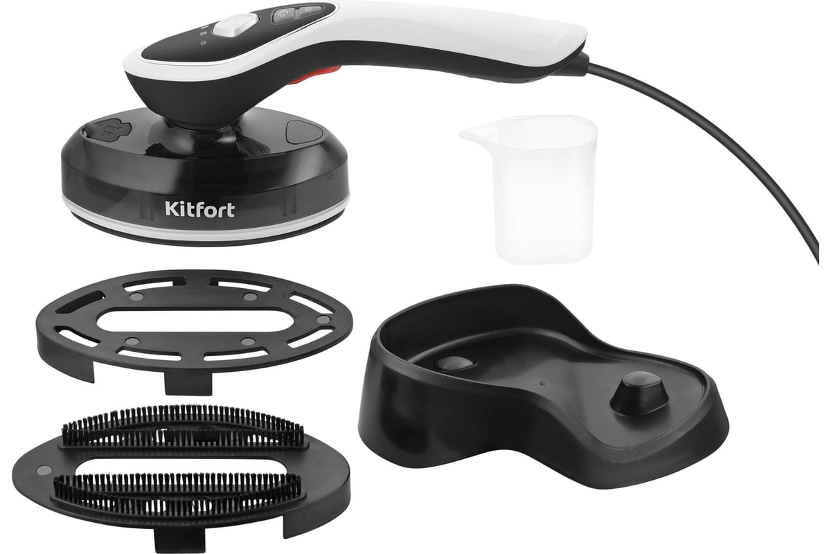 В комплекте к отпаривателю поставляется мерный стакан для удобного добавления воды в резервуар, насадка для отпаривания деликатных тканей и ворсовая насадка, которая позволяет почистить вещи от пыли, волос или шерсти при отпаривании. Также в комплекте есть чехол для удобного хранения аксессуаров. Чтобы отпариватель можно было поставить в перерывах при отпаривании и глажке или оставить остывать, в комплекте предусмотрена специальная подставка с термоустойчивыми упорами.