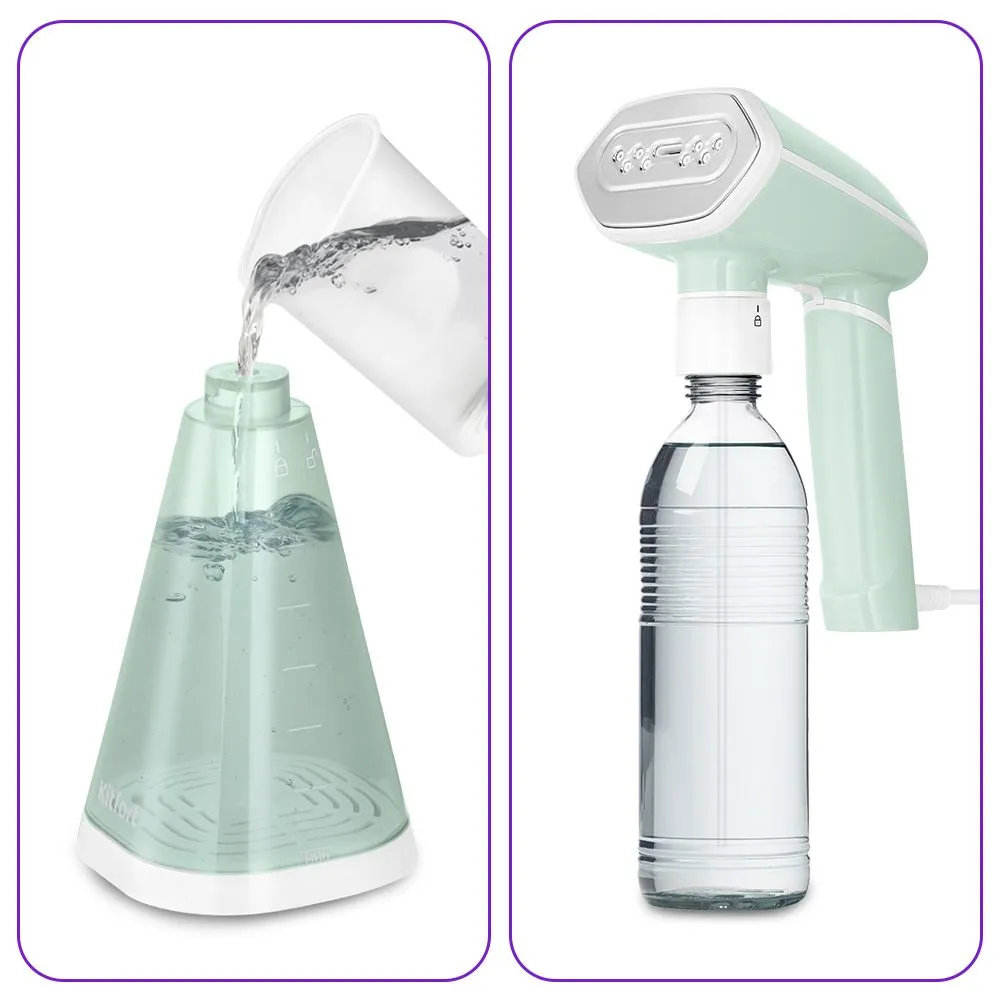 В комплекте с КТ-9232 идет специальный переходник для бутылки, который позволяет использовать отпариватель с пластиковыми бутылками вместо резервуара для воды. Подходящий размер – это бутылки 0,5, которые можно купить в любом магазине.