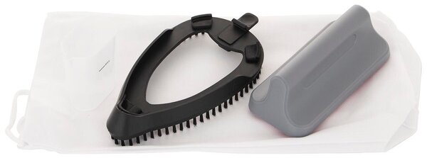 В комплекте с 4 аксессуара: тканевая щетка, разглаживающая ткань для лучшего распределения пара, ворсистая подушка для удаления волос, ворса и шерсти животных, мерный стакан для долива воды, дорожная сумка.