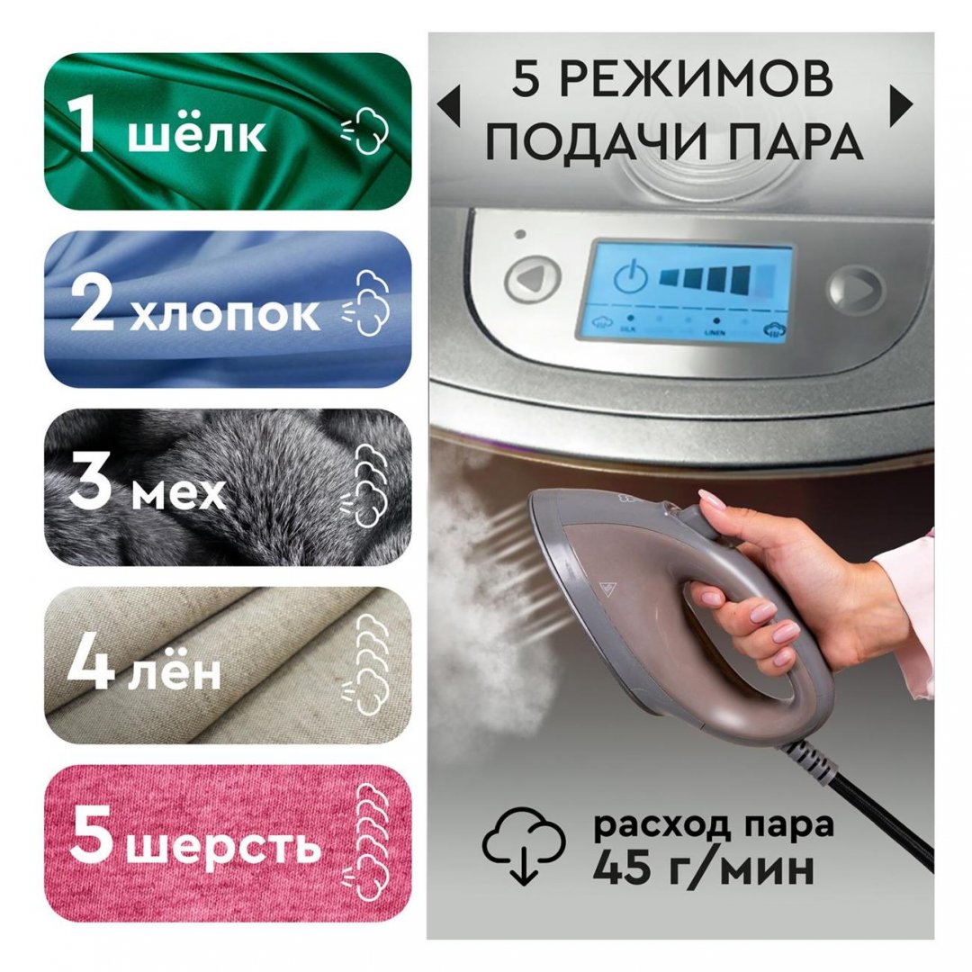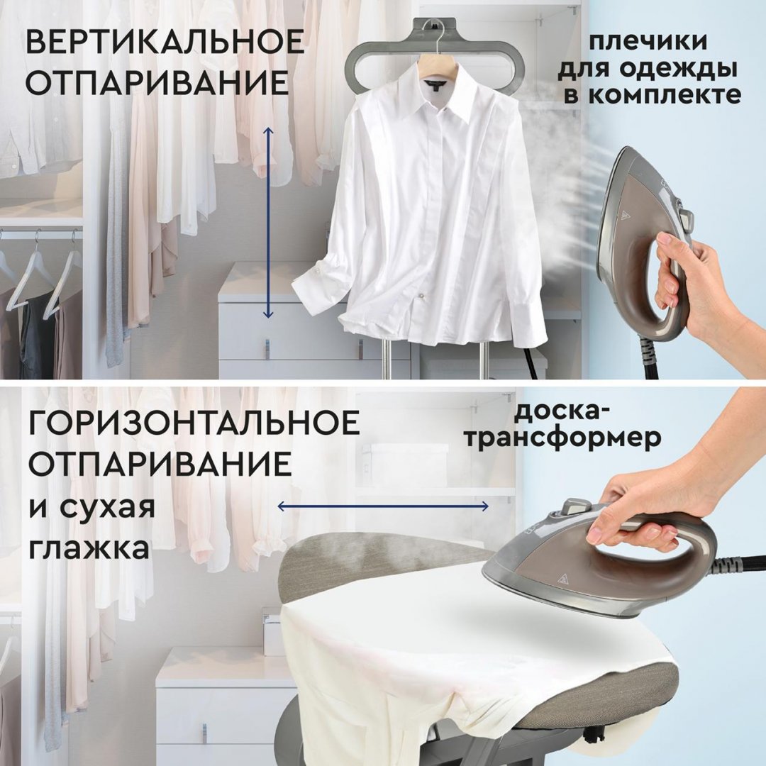 Вертикальный отпариватель Planta 2 в 1 PLS-V100 оснащен телескопической стойкой, которая регулируется по высоте исходя из длины одежды. Сетевой кабель автоматически сматывается при нажатии на специальную клавишу. На ручке имеется прорезиненное покрытие, благодаря чему устройство не скользит в ладони. В основании предусмотрены колеса, что способствует комфортной транспортировке модели. В комплекте поставляется рукавица, которая защищает кисть от ожога в процессе глаженья, что обеспечивает безопасные условия эксплуатации.