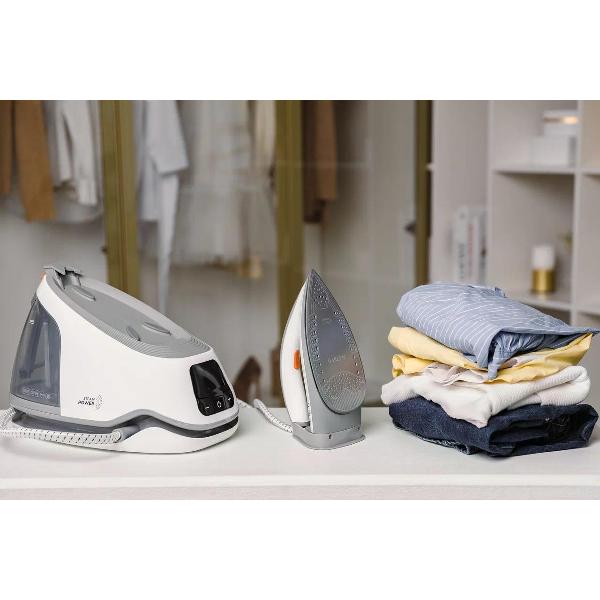 Объем резервуара для воды — 1,5 л, поэтому можно гладить долго, не отвлекаясь на долив. Когда вода закончится, прозвучит сигнал. Также парогенератор предупредит о необходимости провести цикл очистки от накипи. Безопасность обеспечивает система автоматического отключения, которая срабатывает через 10 минут простоя.