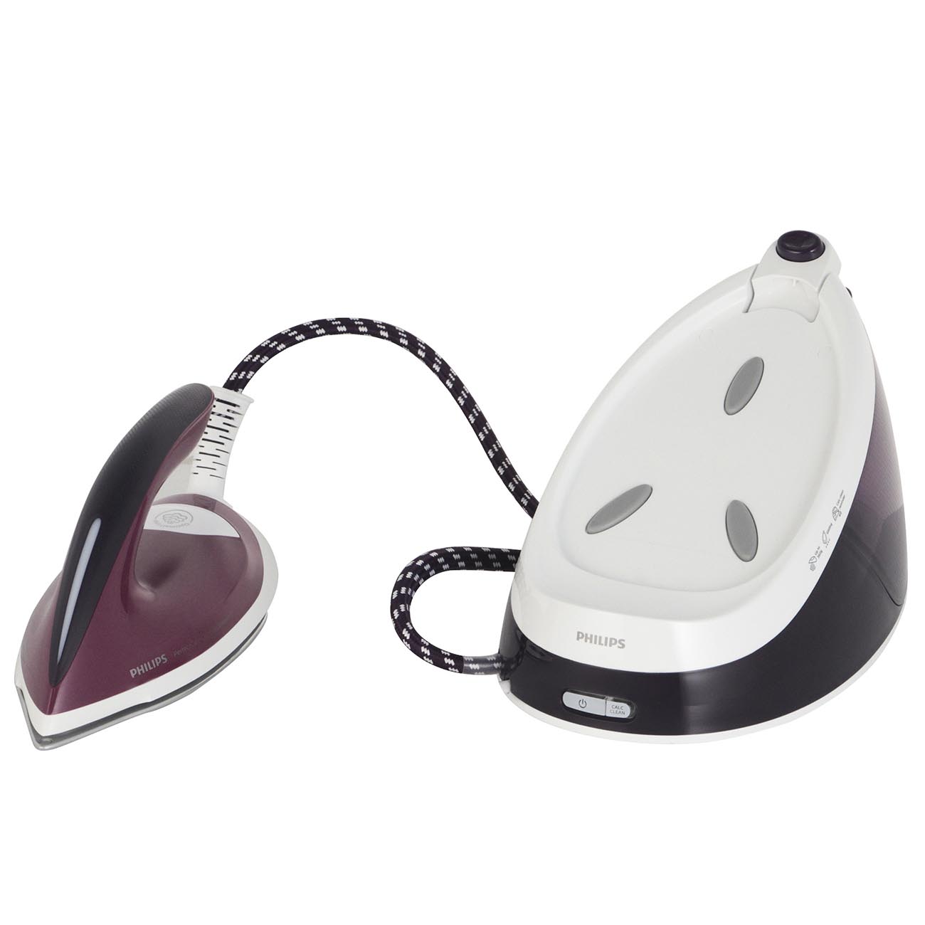 Функция самоочистки от накипи позволяет не просто поддерживать внутренние узлы бытового помощника в чистоте, но и значительно продлить срок его службы. Для этого наполните 1,3-литровый резервуар для воды наполовину, поставьте утюг в предусмотренный в комплекте контейнер Calc-Clean, затем нажмите и удерживайте специальную кнопку в течение двух секунд. Загрязнения будут некоторое время выходить из отверстий в подошве – вам останется лишь протереть её и помыть ёмкость.