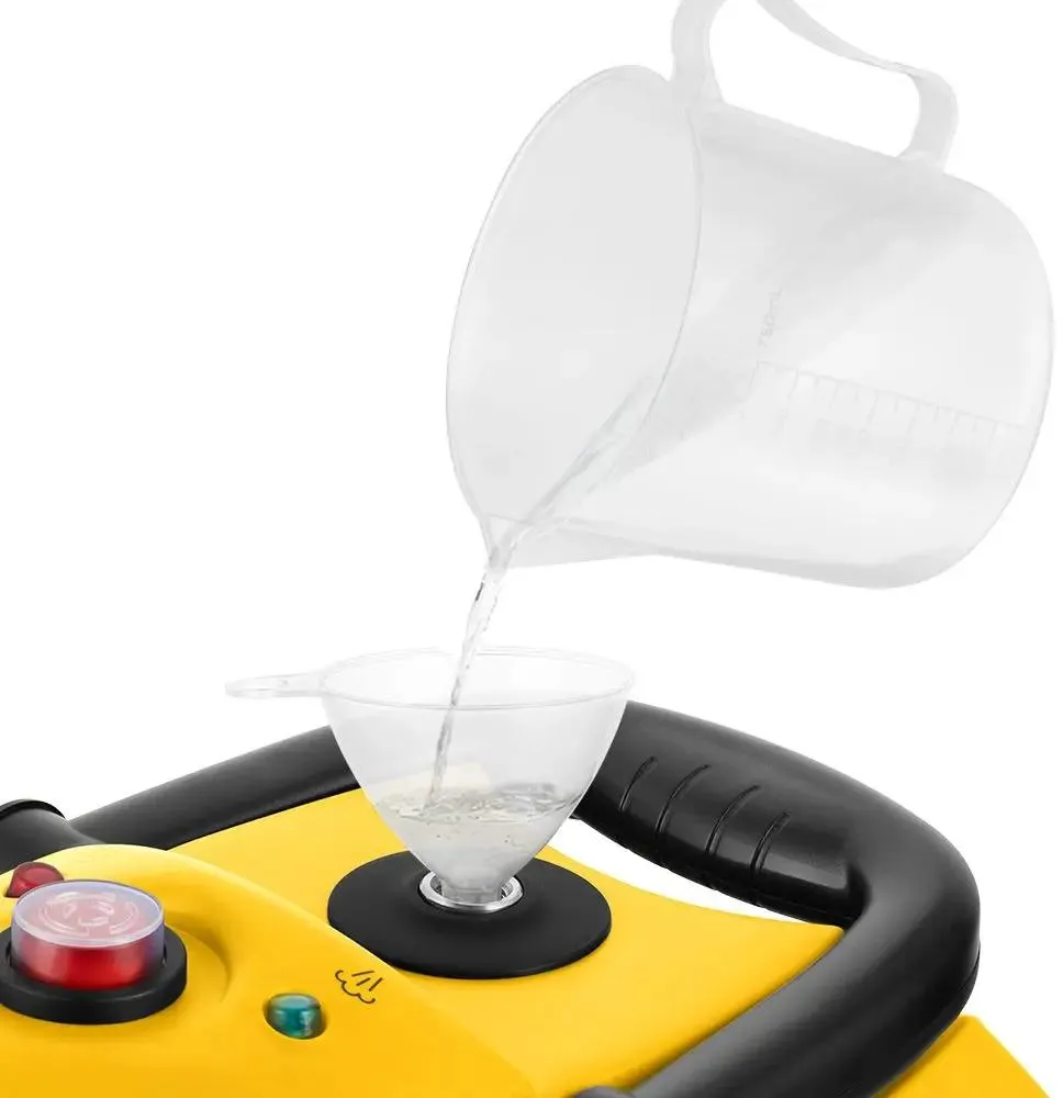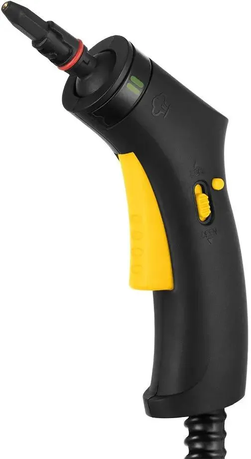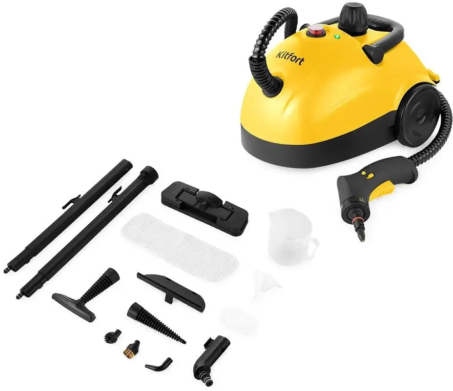Управление пароочистителем механическое. Номинальная мощность прибора — 1500 Вт. Установлены индикаторы включения и готовности к работе. Длина сетевого шнура — 2,6 м. Цвет корпуса — черно-желтый. Вес составляет 3,86 кг. В комплект входит набор насадок, которые подходят для разных случаев уборки: для мытья полов, для отпаривания ткани, для сильных загрязнений, скребок, для мытья стекол, точечная насадка с щеткой, насадка для труднодоступных мест, тонкое сопло, изогнутое сопло, насадка-щетка.