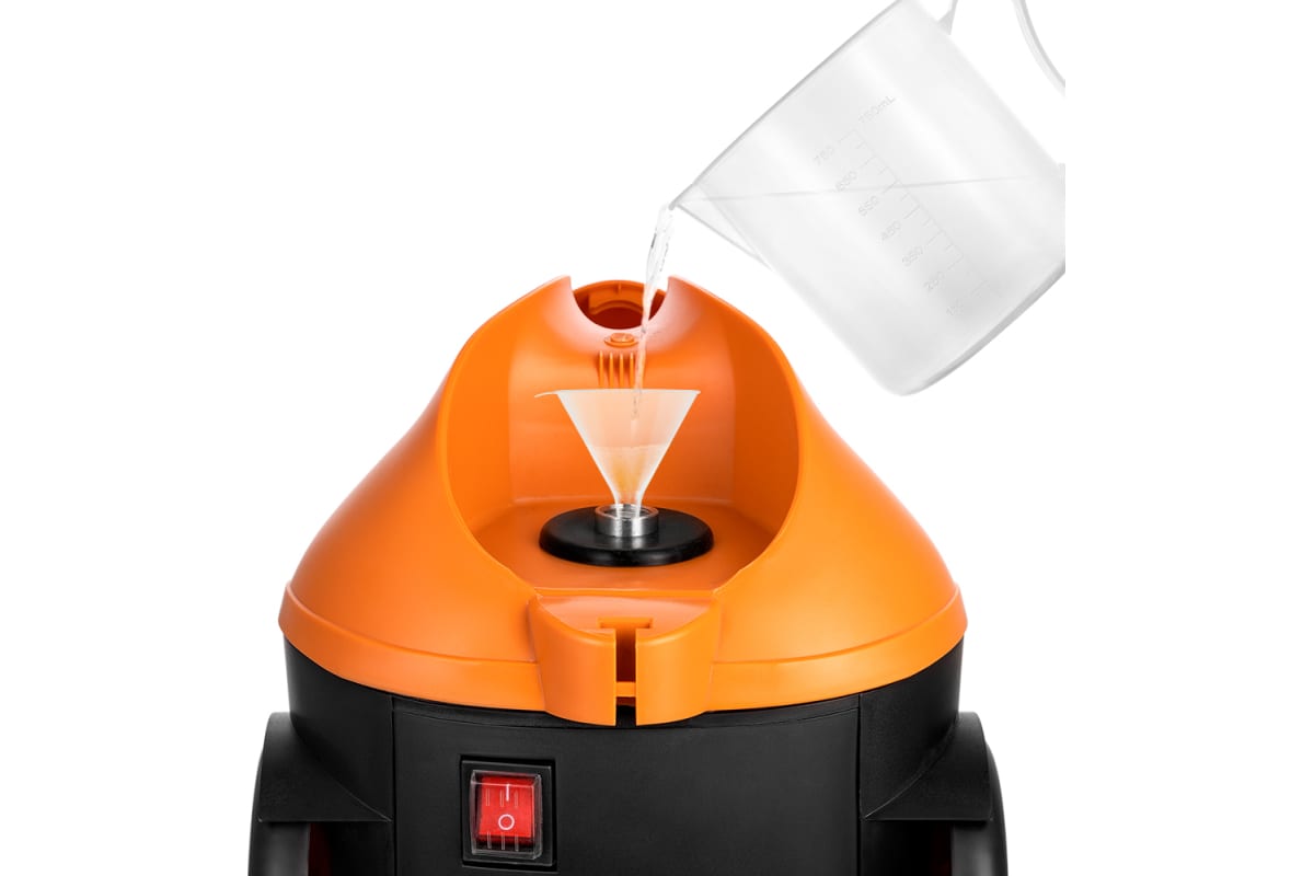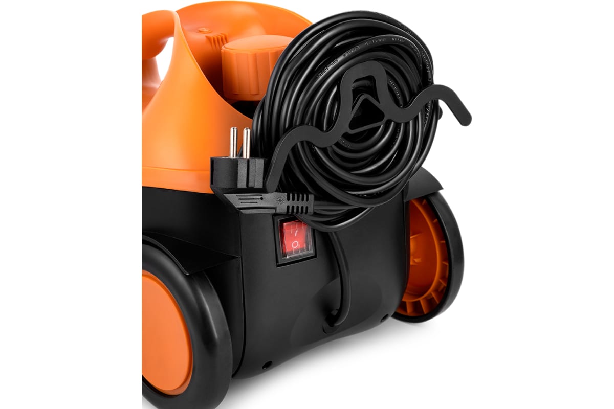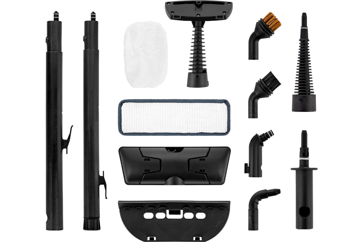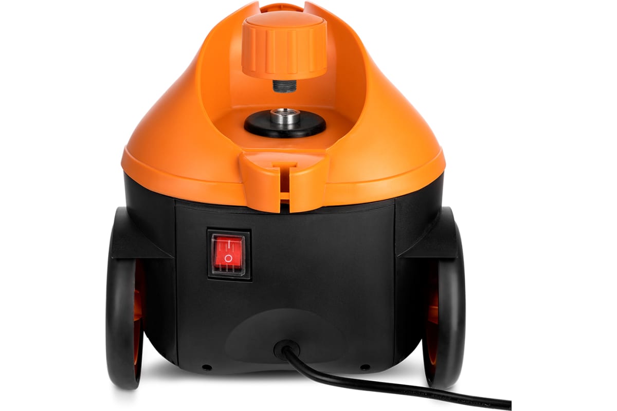 На корпусе пароочистителя есть ручка для переноса. Колеса позволяют с легкостью перемещать пароочиститель, не поднимая его. Паровой пистолет можно вставить в специальный отсек на корпусе пароочистителя для более удобного хранения прибора. Большое количество насадок в комплекте поможет очистить труднодоступные или сильнозагрязненные поверхности.