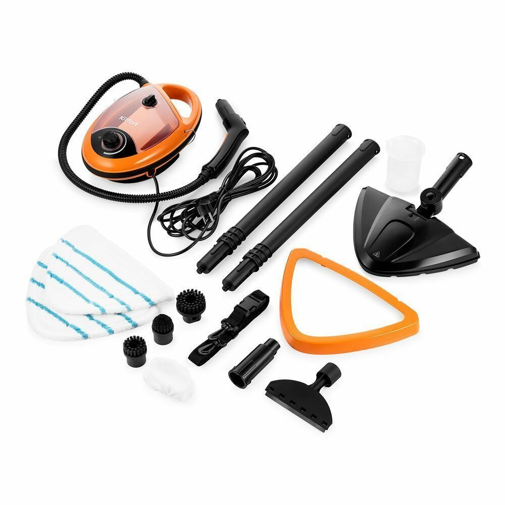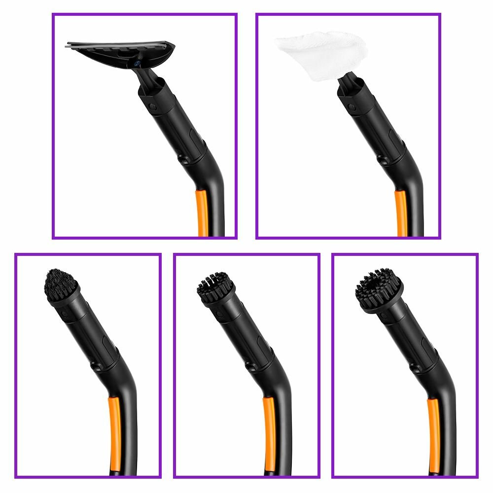 насадка для пола, насадка-зажим, насадка-скребок, большая круглая нейлоновая щетка, коническая нейлоновая щетка, малая круглая нейлоновая щетка, мерный стакан, насадка для отпаривания, рамка для ковра, тряпка для пола