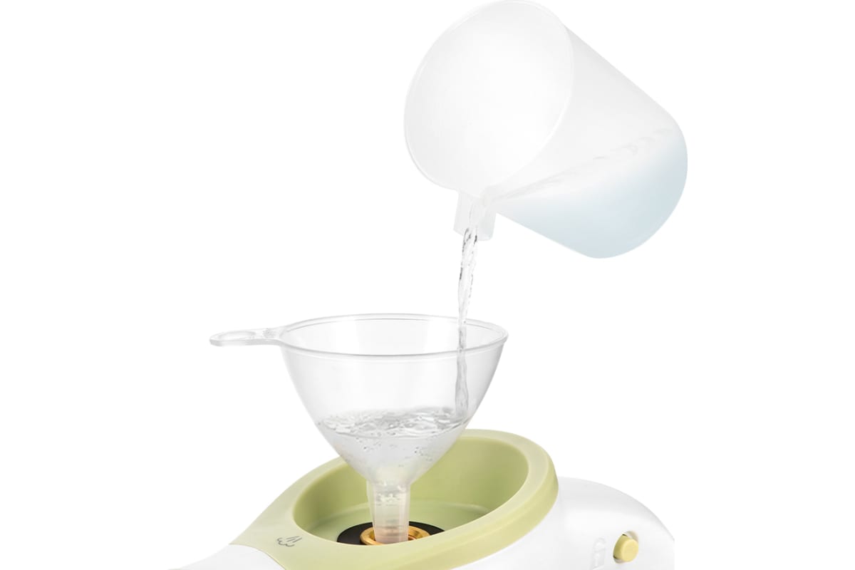 В устройство удобно наливать воду благодаря наличию воронки и мерного стакана.