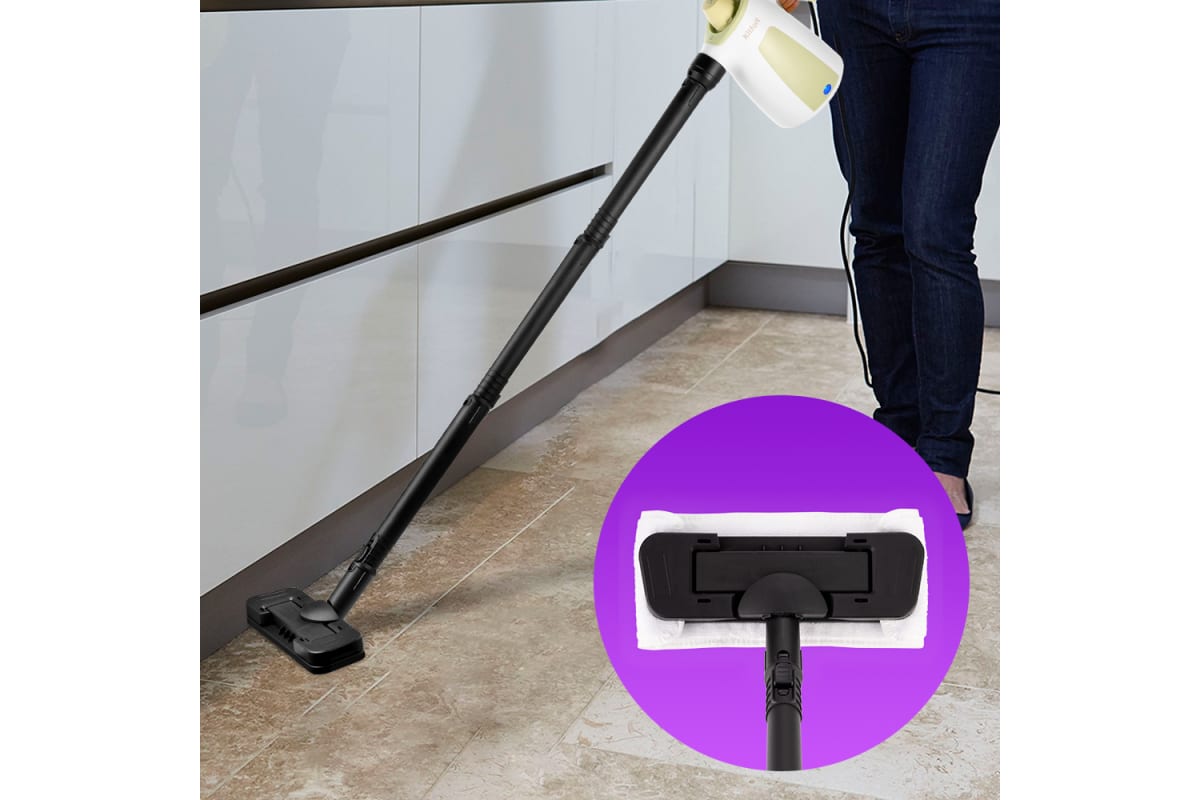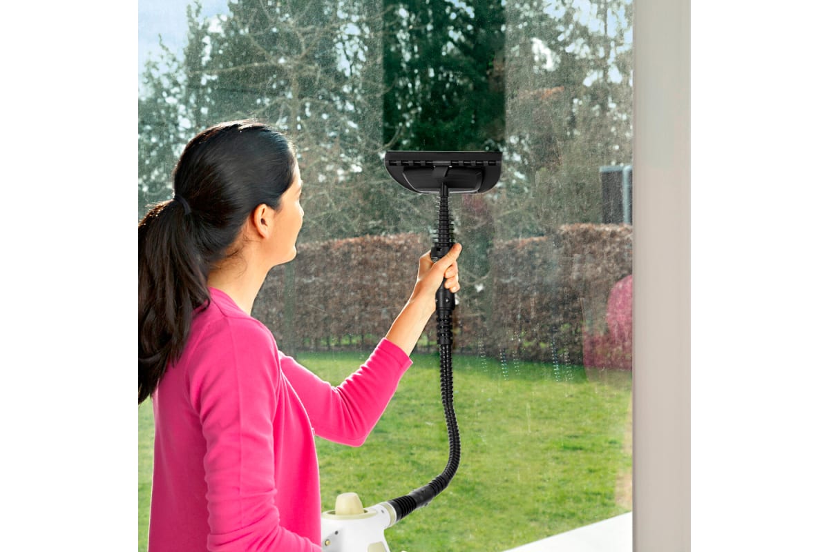 В случаях серьезного загрязнения используйте нейлоновую щетку, а также чистящие средства, которые надо наносить на загрязнения. Для очистки окон, зеркал и кафельной плитки используется насадка с резиновым скребком. Чтобы отпарить одежду и почистить обивку мягкой мебели, в комплекте есть тряпка для отпаривания, которая надевается на насадку для отпаривания. Благодаря наличию парового шланга есть возможность очистить труднодоступные места. Струйная насадка может использоваться для очистки плинтусов, щелей между плитками, протектора обуви и других труднодоступных мест. Угловая насадка справится с загрязнениями в таких местах, как углы и радиаторы отопления. Напольная щетка, которая подсоединяется к удлинительным трубкам, служит для очистки напольных покрытий.