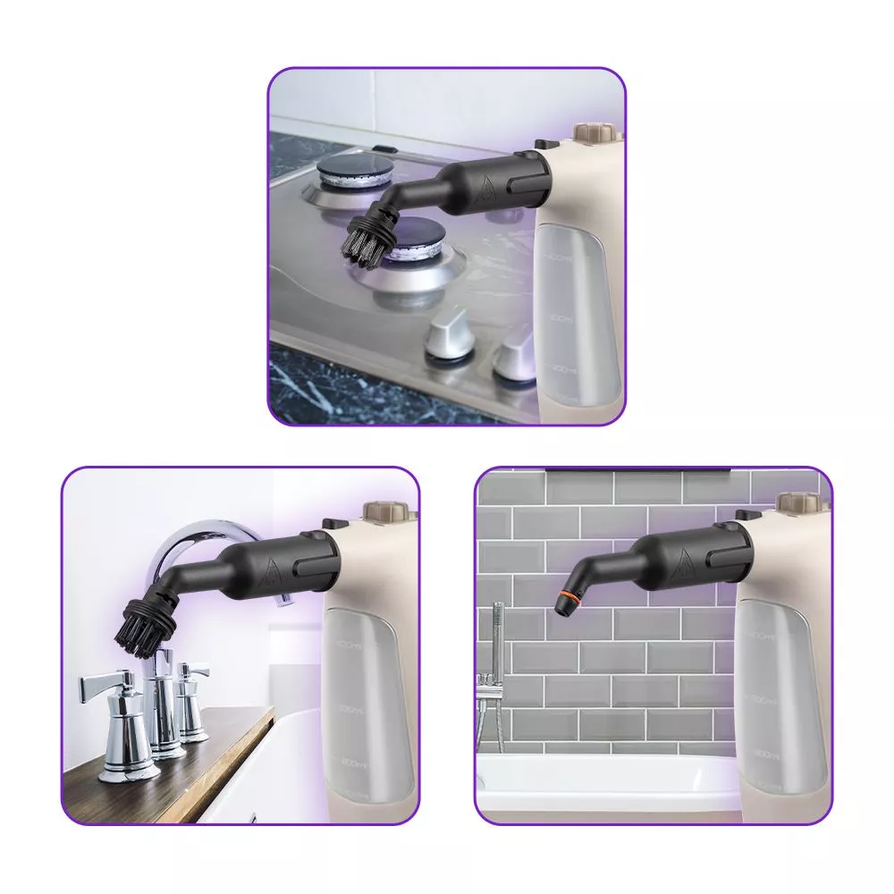 Большое количество насадок в комплекте поможет очистить труднодоступные или сильнозагрязнённые поверхности. Для очистки не требуется применять моющие средства, поэтому прибор безопасен для здоровья и не приносит вреда окружающей среде.
