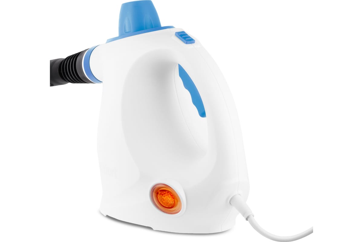 Пароочиститель компактный и легкий. На корпусе есть ручка для переноски.