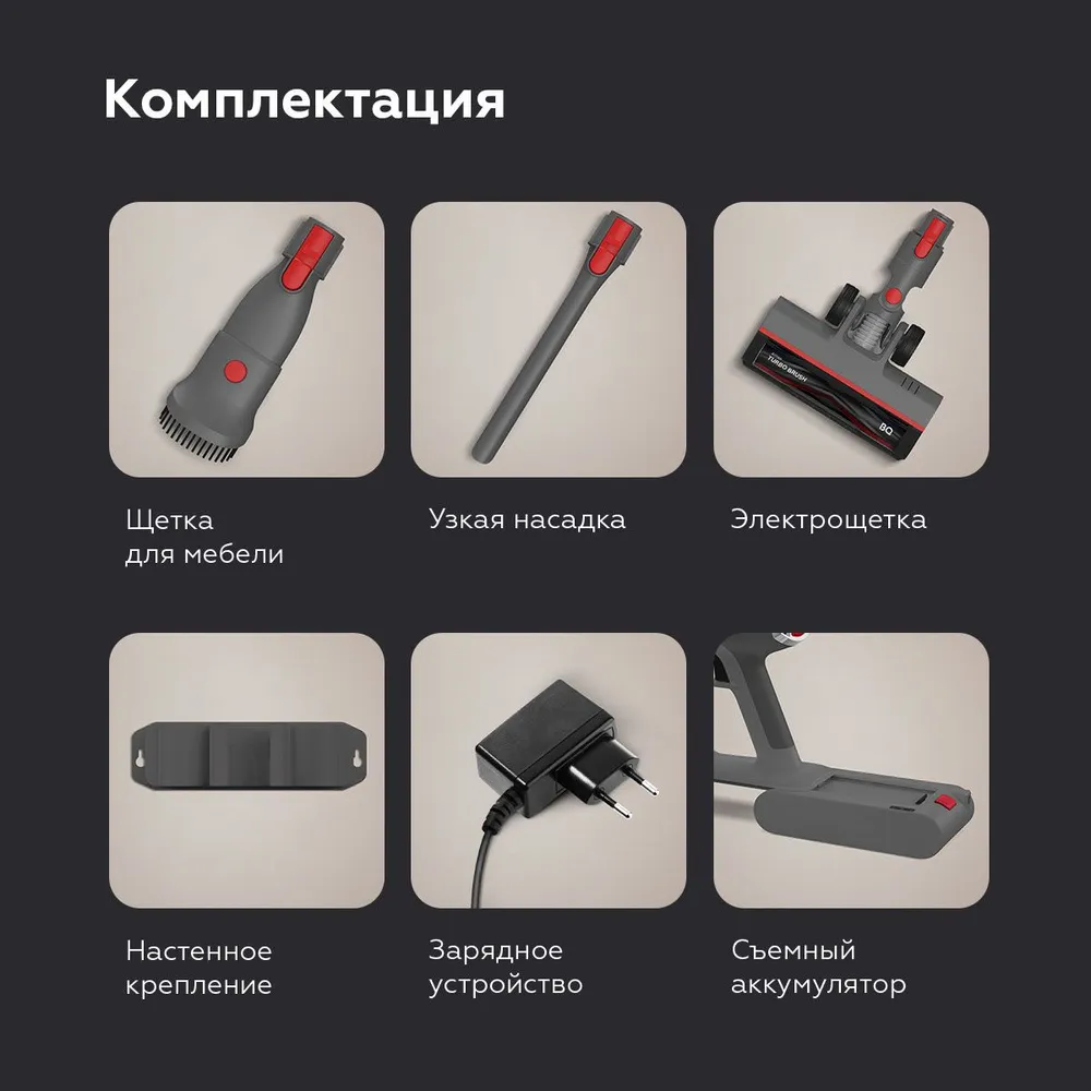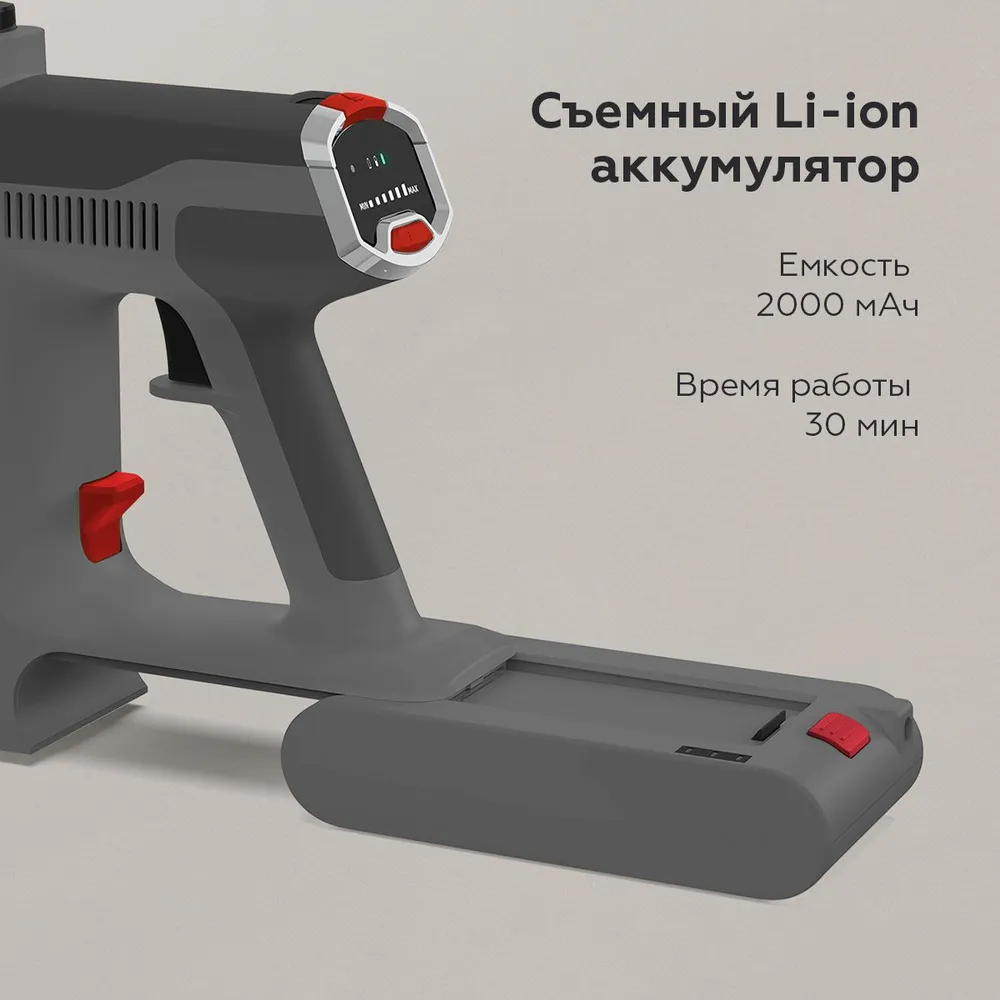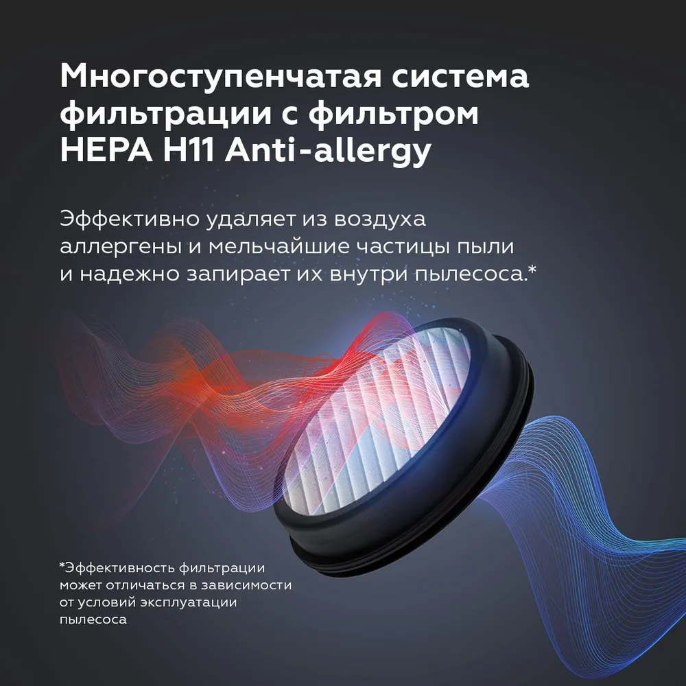 С этим пылесосом вы получите до 30 минут автономной работы на одном заряде, что позволит вам убрать всю квартиру без лишних забот о розетках. Благодаря циклонной фильтрации и высококачественному HEPA H11 Anti-allergy фильтру, воздух в вашем доме останется чистым. Фильтр задерживает даже самые мельчайшие частицы пыли и аллергенов. Вы также можете выбирать между двумя уровнями мощности, чтобы оптимизировать уборку в зависимости от типа поверхности и степени загрязнения.Съемный Li-ion емкостью 2000 мАч аккумулятор облегчает процесс подзарядки и замены, что обеспечит вам максимальную гибкость. В дополнение к этому, у пылесоса есть турбощетка с LED-подсветкой, позволяющей обнаруживать даже самые мелкие загрязнения. Низкий уровень шума делает его использование комфортным, независимо от времени суток.