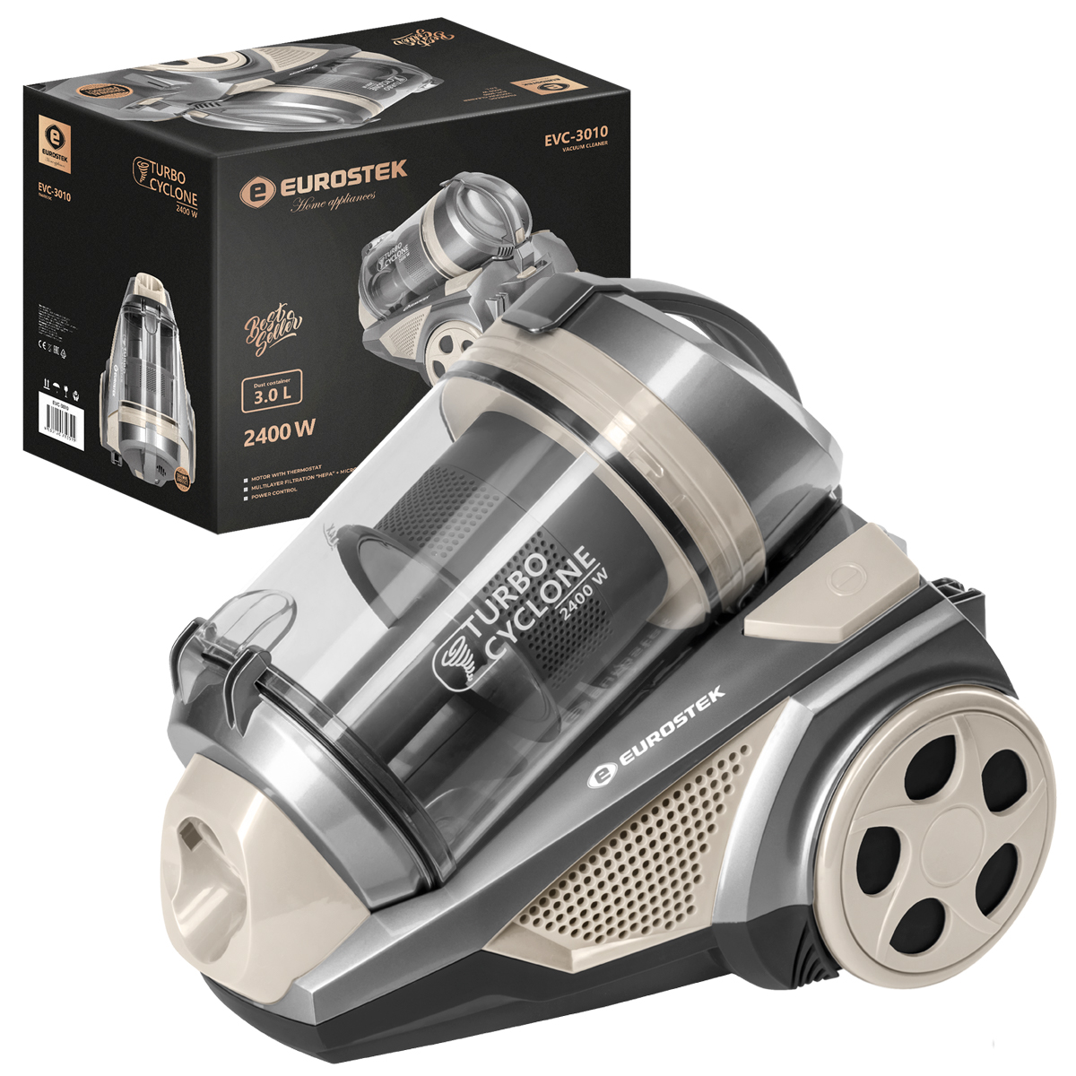 Пылесос без мешка Eurostek EVC-3010 технология МУЛЬТИ-Циклон, Многоуровневая система фильтрации: HEPA-фильтр+ микрофильтр, Максимальная мощность 2400 Вт., мощность всасывания 420 Вт., телескопическая металлическая трубка и щетка для пола, объем пылесборника 3 литра, длина шнура 5 метров, защита от перегрева, автоматическая смотка шнура, мотор с термостатом