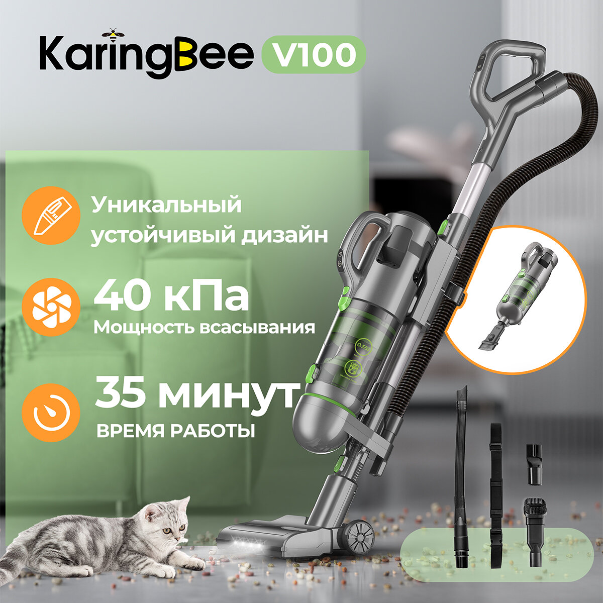 Мощный аккумуляторный вертикальный пылесос KaringBee V100 предназначен для простой и эффективной сухой уборки. Этот современный пылесос создан для тех, кто ценит чистоту и комфорт.