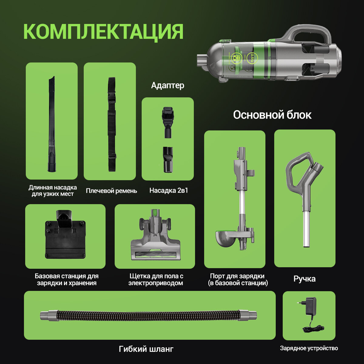 Большие колеса, Вертикальная парковка, Плечевой ремень, Подсветка зоны уборки, Регулировка мощности, Сбор золы, Съемный ручной пылесос